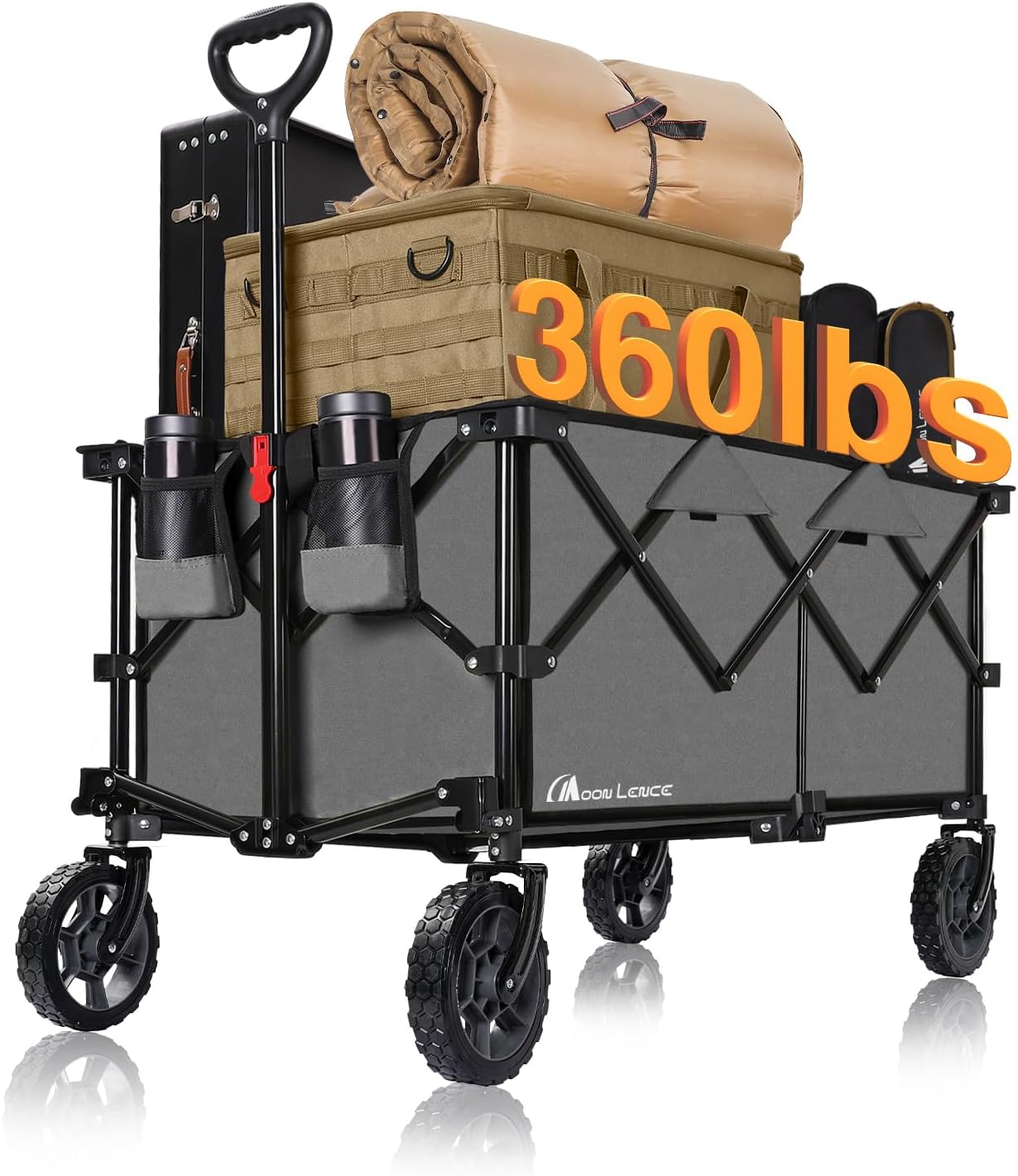 Moon Lence Collapsible Folding Wagon Cart Heavy Duty Folding Garden Portable Hand Cart with All-Terrain Beach Wheels, Adjustable Handle & Drink Holders (Grey)