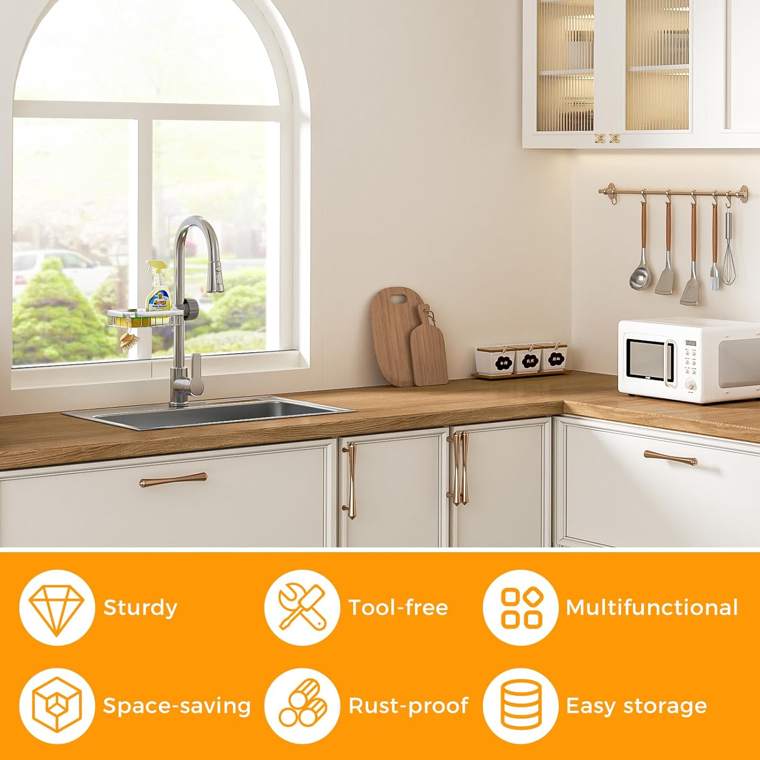 - Multi-functional Design: Our stainless steel kitchen faucet organizer rack does more than just hold sponges—it also acts as a dish brush stand, soap holder, and more. It fits over various kitchen faucet sizes.