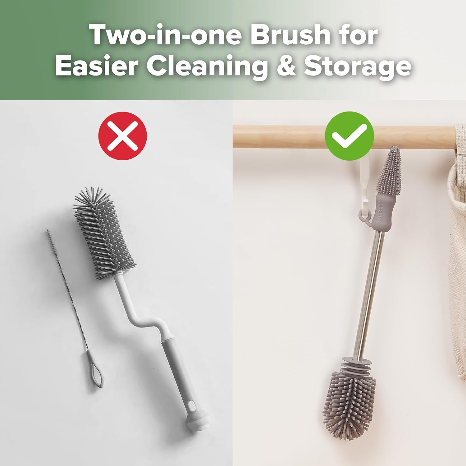 - Multipurpose Bottle Brush - Two different sizes of brush heads: ①Bottle Brush Head - perfectly-sized for scrubbing your baby bottles, breast pumps, and breastmilk storage bags. ②Angled Brush Head with an angled tip - reaches corners of your breast milk collectors, bottle teats and more.