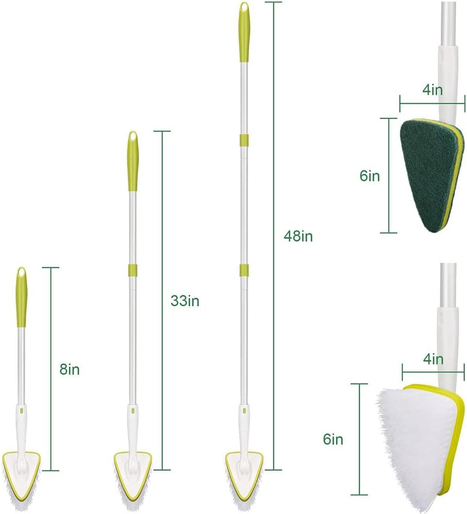 - CQT BATHROOM BRUSH WITH LONG HANDLE--You will get 3 x Pole Parts(Detachable), 1x Bristles Stiff Brush, 2 x Replaceable Brush Head and 2 x Replaceable Sponge Head.Long handled scrub brush extends from 31.5" to 48" with a quick twist without bending or climbing.