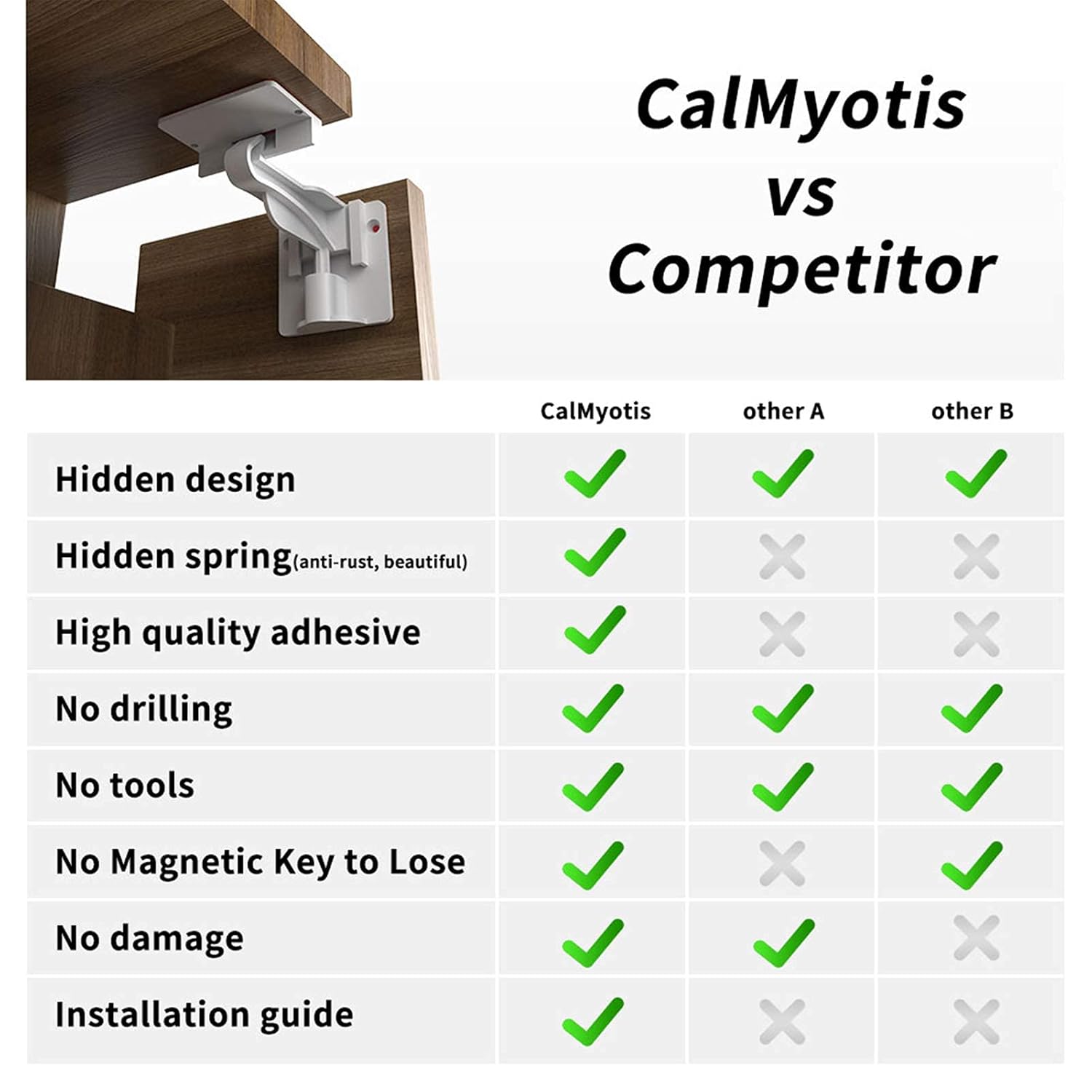 - Sturdier Build: Don’t settle for second best! Magnet locks are notorious for breaking within days. Some safety locks have to be bent down to unlatch, so over time they stay bent & stop working. We use a strong internal spring that makes unlatching easy (for adults!), and keeps our locks working perfectly.