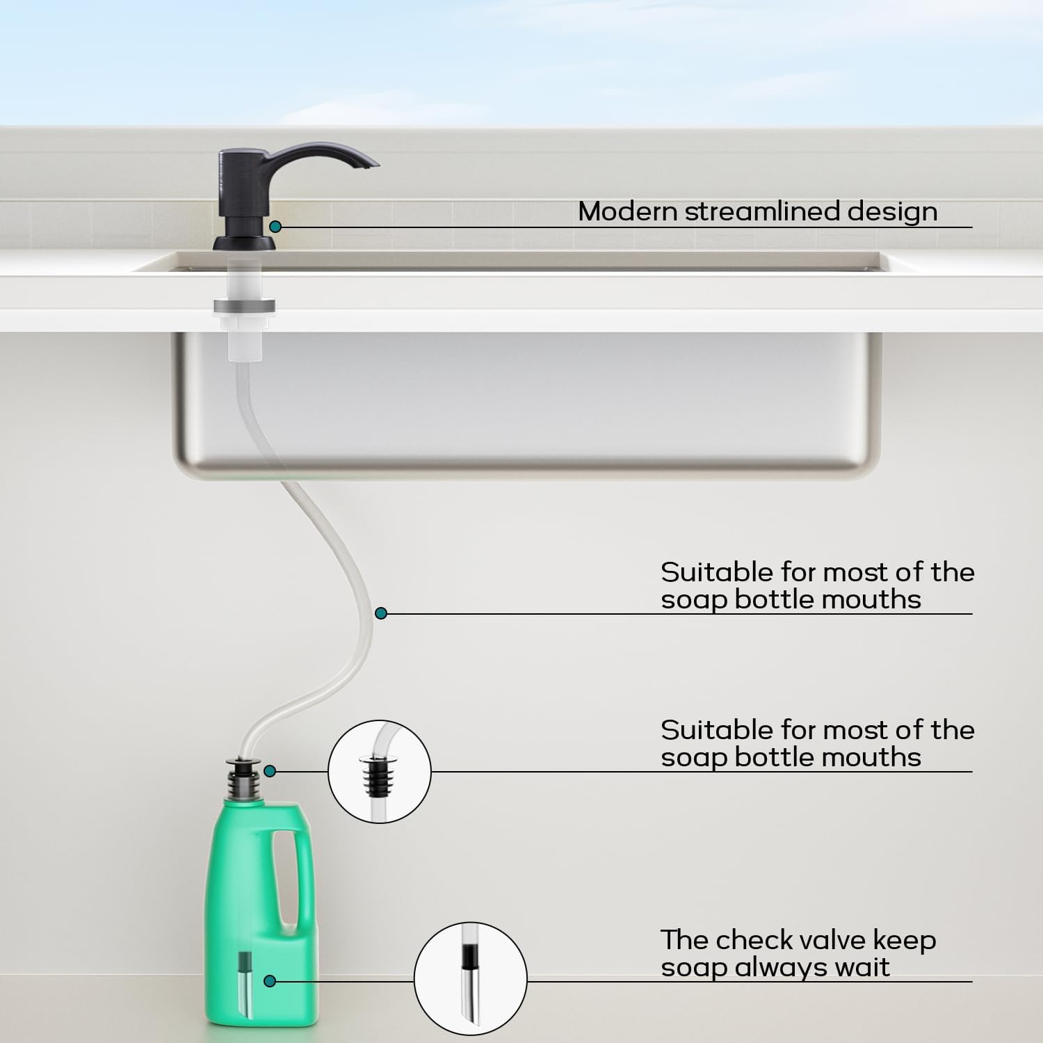 - 【Innovative Design】- The dispenser's metal check valve guarantees the tube stays submerged at the container's bottom, providing consistent suction for liquid soap, lotion, or detergent, ensuring soap dispenses with every push.