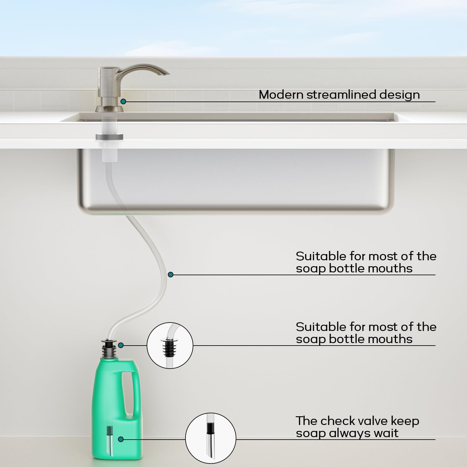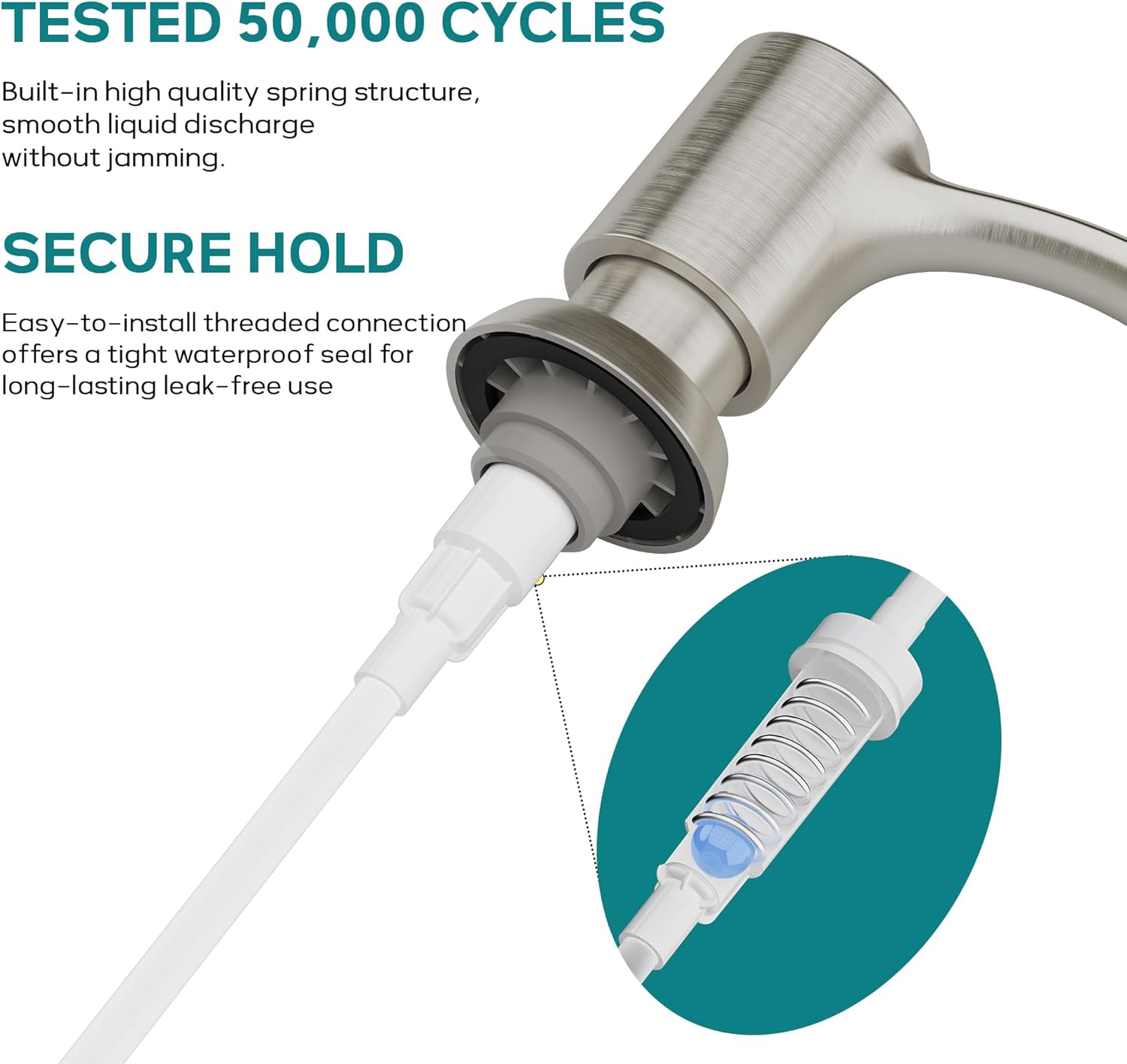 - 【Durable Construction】- The dispenser is built with a sturdy ABS pump head, a metal check valve, and a food-grade silicone hose and stopper, all designed to resist acids and corrosion. The brushed nickel finish is fingerprint and water spot resistant, simplifying cleaning and upkeep.