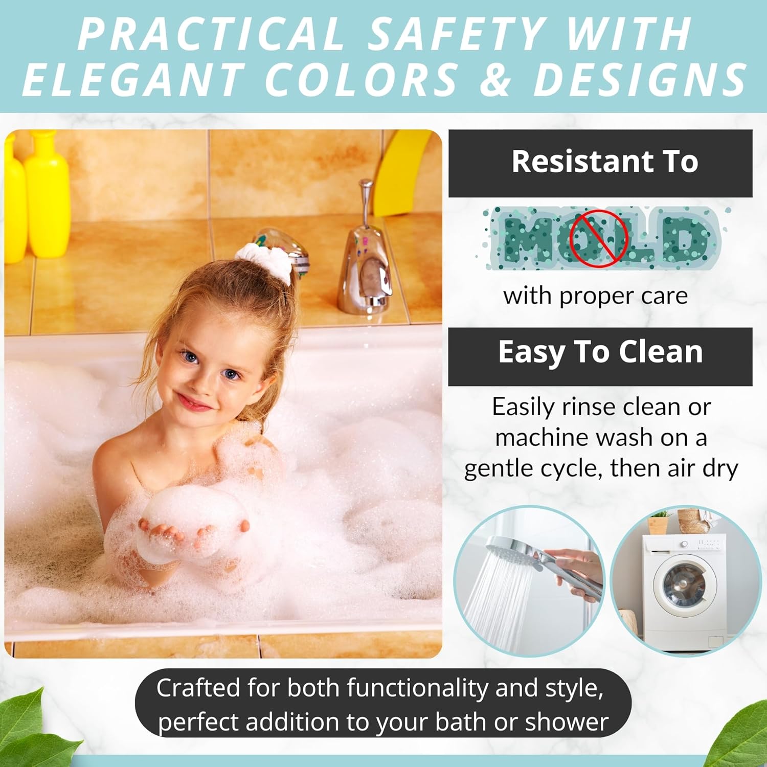 - EASY TO CLEAN Crafted from durable, easy-to-clean, and safe materials, this bath mat simplifies maintenance. Rinse it in the shower or tub, or toss it in the washing machine for a quick and convenient clean.