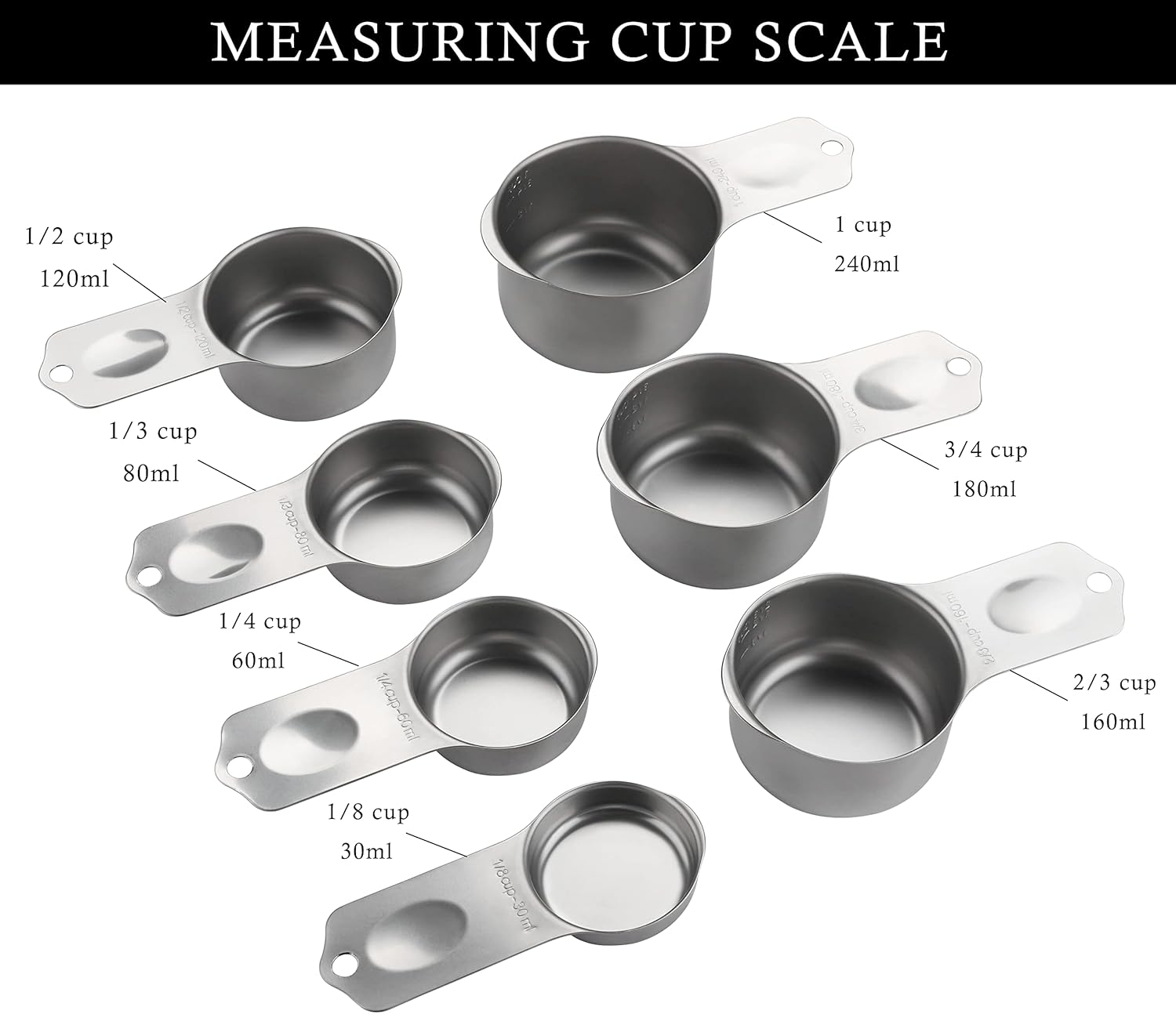 - 【MEASURING CUP SET】The stainless steel measuring cups set sizes include 1/8 cup,1/4 cup,1/3 cup,1/2 cup,2/3 cup,3/4 cup,1 cup.Seven different sizes for you to use in cooking or baking.