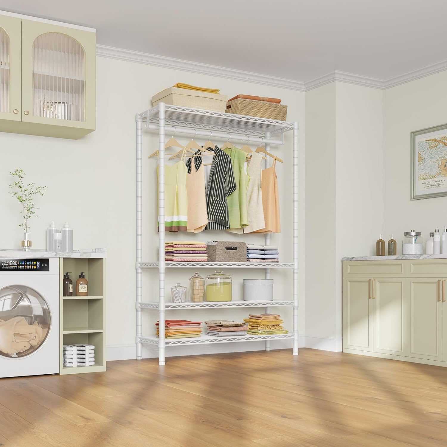 - MULTIFUNCTION: 4 Tiers Garment Rack ensure you enough space to place your clothes, accessories, bedding, lining, shoes, etc. Single clothes hanging rod holds up to 90 lbs, it is great for hanging suits, coats, long dresses, jackets, pants, shirts or other heavy clothes.