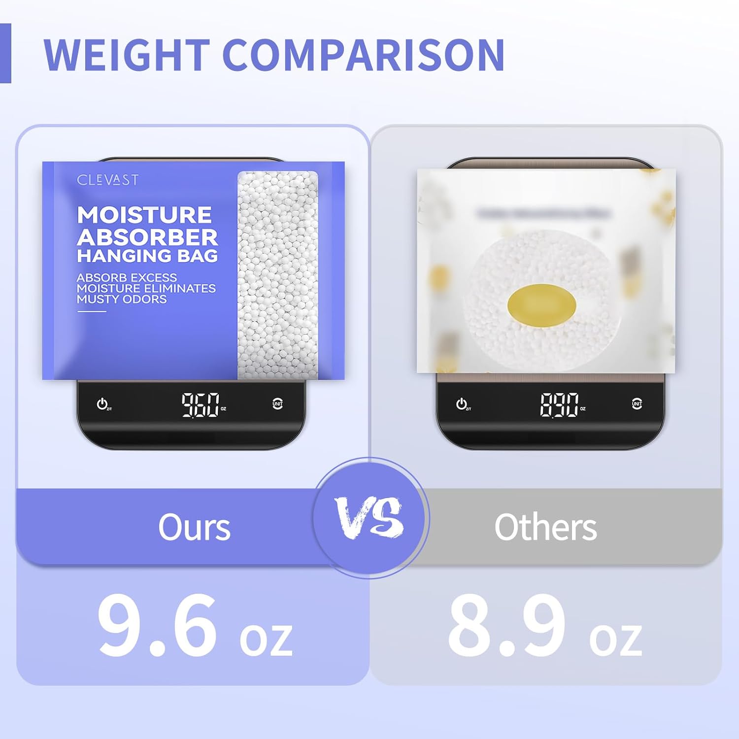 - EFFECTIVE DEHUMIDIFICATION: The CLEVAST dehumidifier bags feature spherical calcium chloride particles that can attract and absorb excess moisture quickly and efficiently. Moisture absorbers are designed with a premium one-way moisture-permeable paper that will securely lock the moisture inside.(WHEN the temperature drops sharply or the humidity is low, crystals may appear inside the bag, and no water droplets at the bottom. This is normal, please be patient for the product to work)