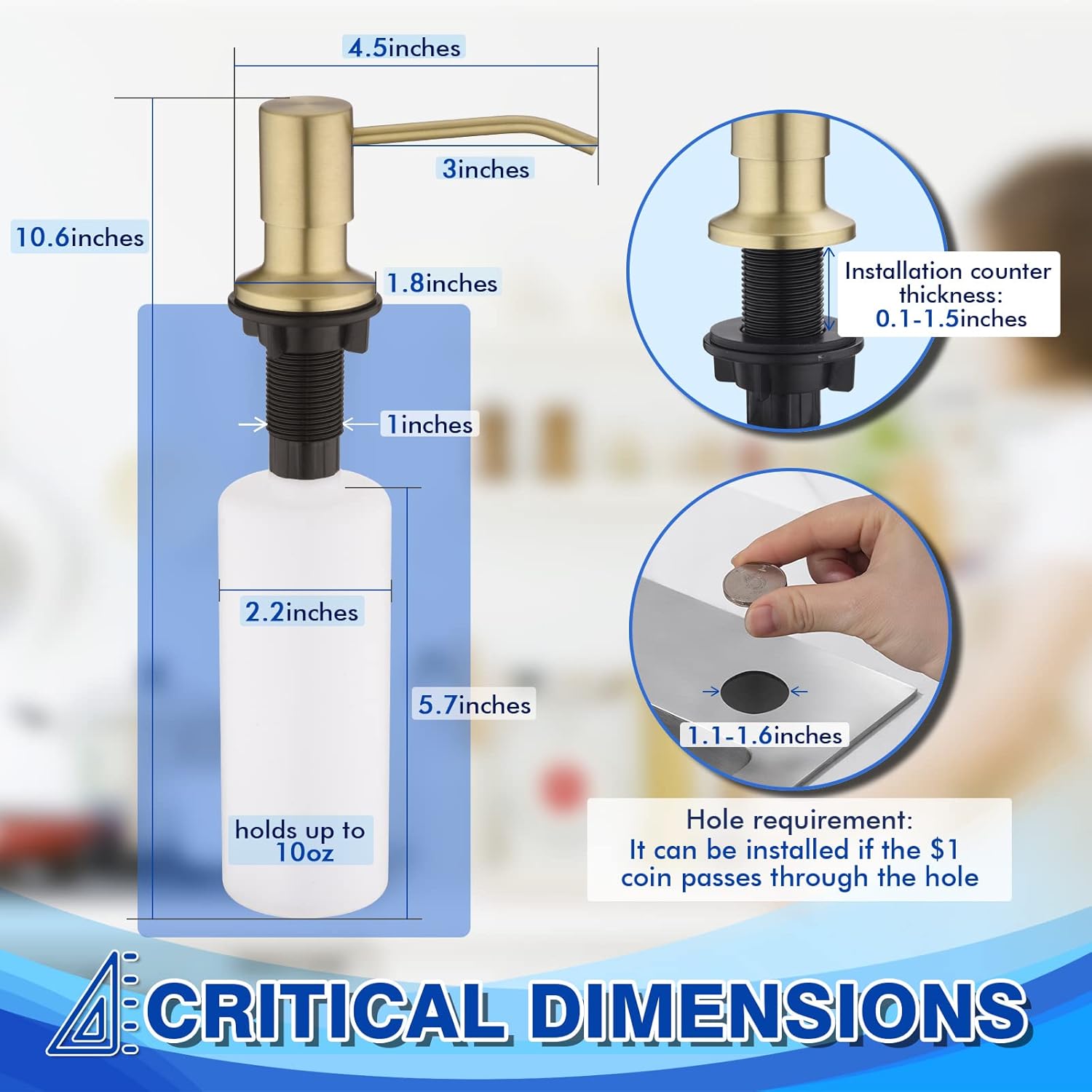 - 【Optimization Design】High quality gold dish soap dispenser makes your kitchen room simple and fresh, easy to fit most sink. You can install it in any type of kitchen sink or countertop (granite, stainless steel, wood), making you more convenient to use.