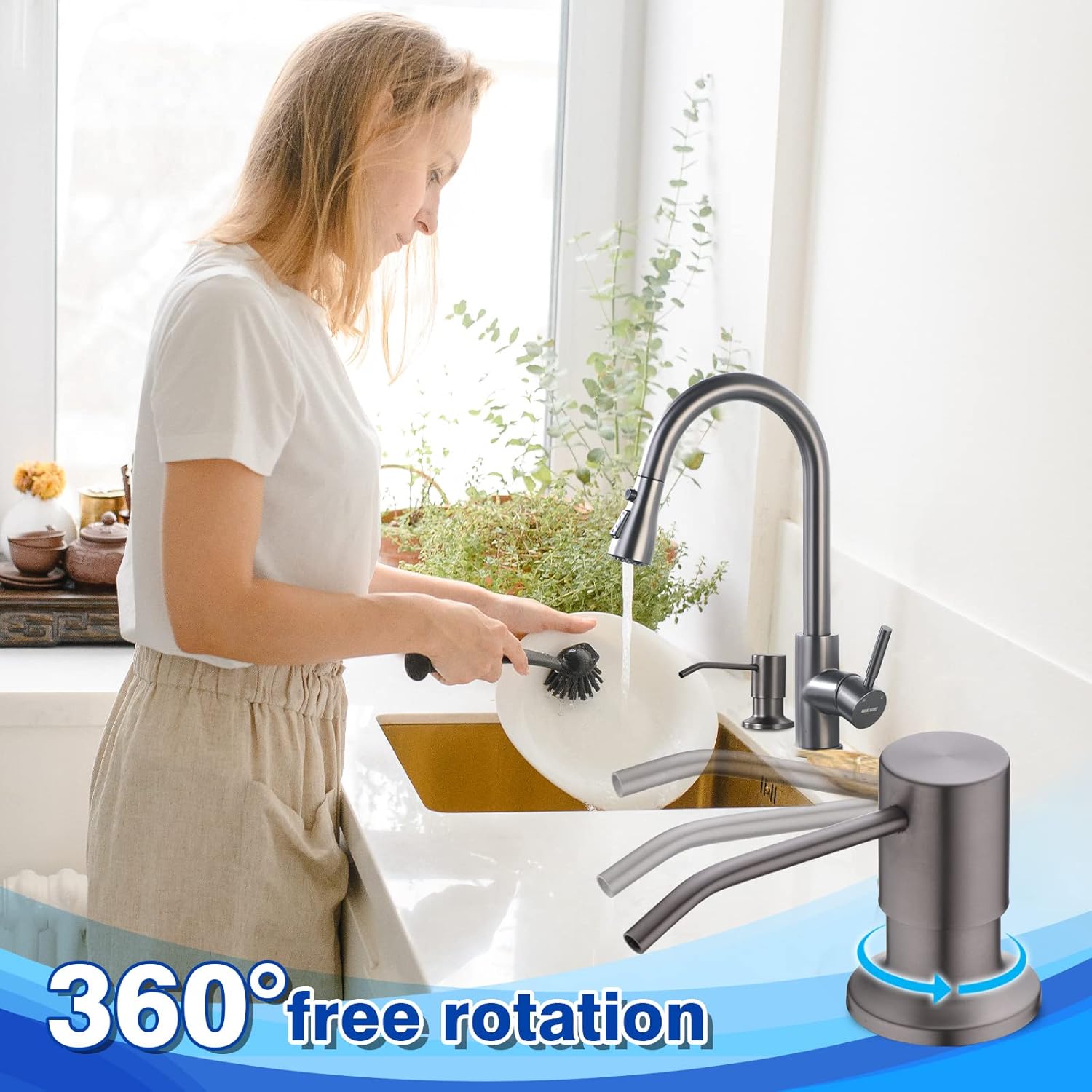 - Optimization Design: First-rate matte gray under counter soap dispenser makes your kitchen simple and fresh, easy to fit most sinks. Installing it in any type of kitchen sink or countertop (granite, stainless steel, wood)makes it more convenient to use.