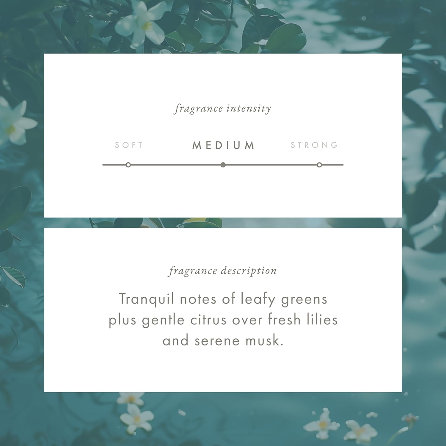 - TRANQUILITY LIES IN THE STILLNESS OF A LILY POND, WHERE THE ONLY MOVEMENT COMES FROM THE RIPPLE OF A PASSING DRAGONFLY. Pause on the charming footbridge for a peaceful moment of reflection. Breathe in the fragrant notes of fresh lily, leafy greens, and gentle citrus as the surrounding trees kindly lend their earthy, woodsy musk.