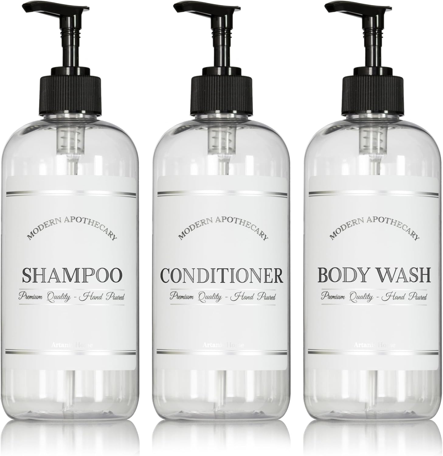 - Bring Style To Your Bathroom: Revel in the luxury of a well-organized shower. Refine your interior decor with these chic body wash, conditioner and shampoo dispenser bottles. Curate your whole home. Modern Apothecary bathroom bottles coordinate with additional matching titles for the sink, kitchen, office, and rentals. Classy, with a touch of retro flair