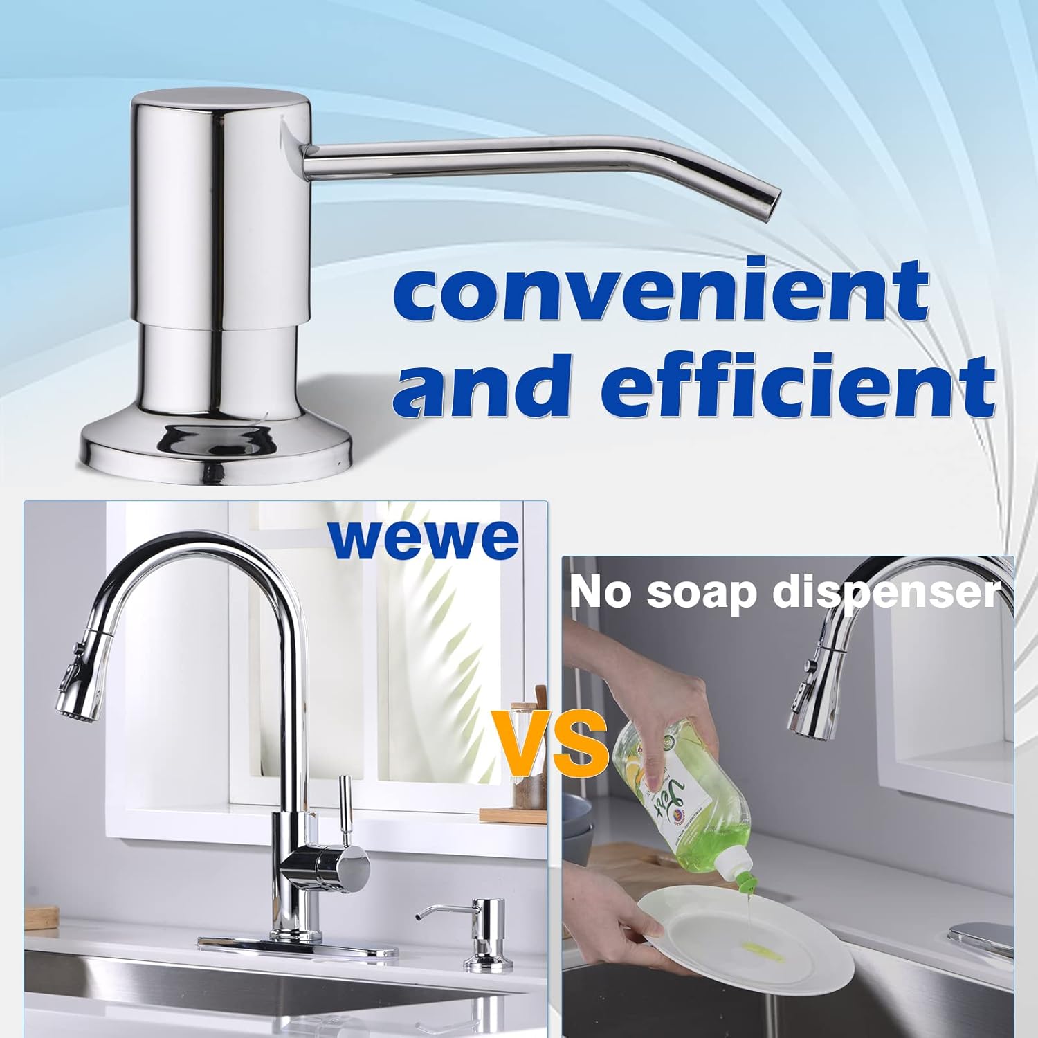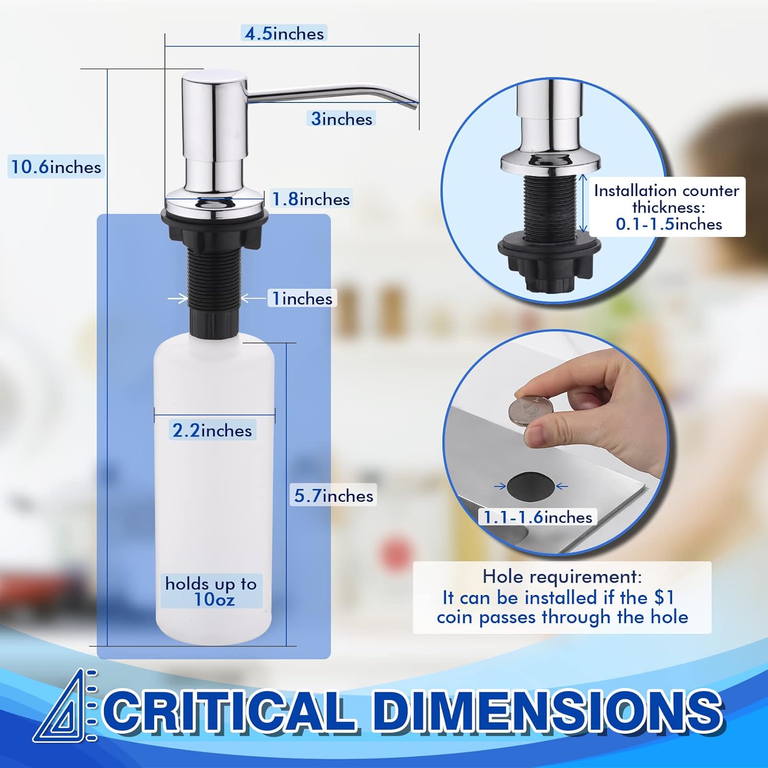 - 【Optimization Design】High quality chrome in sink soap dispenser makes your kitchen room simple and fresh, easy to fit most sink. You can install it in any type of kitchen sink or countertop (granite, stainless steel, wood), making you more convenient to use.