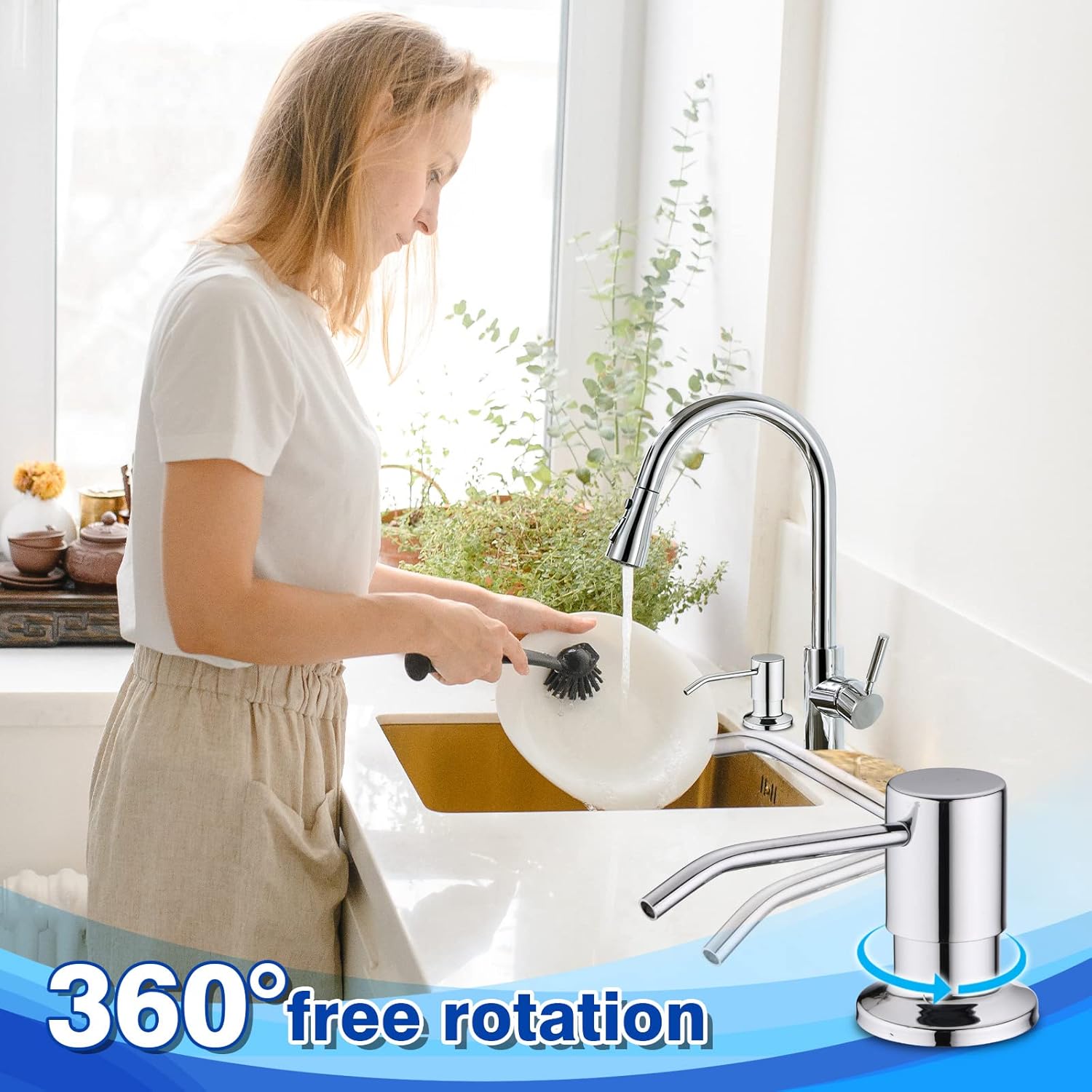 - 【No More Mess】Fitting a long tube kit, the stainless steel soap dispenser for kitchen sink has 360 degree free rotation, meets different hand washing position at any time.