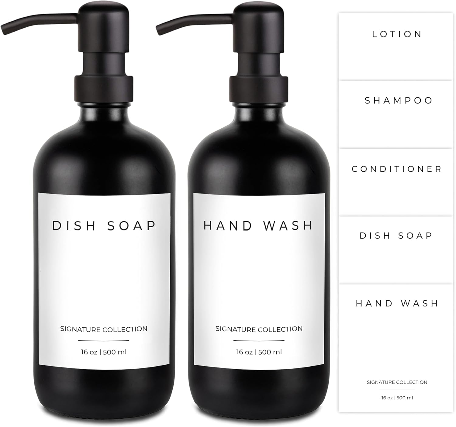 - ✅ 2-in-1 COMBO: Upgrade your home with our glass soap dispenser set. The dish soap dispensers are crafted from the highest quality glass and can be used as soap dispensers for kitchen sinks, soap dispensers for bathrooms, or as hand soap dispenser of your favorite liquid. The kitchen soap dispensers come with 2 dish soap dispensers for kitchen bottles (16 ounces), 2 stainless steel pumps, and 5 waterproof labels. Our selection includes colors including amber, clear, white, and black.
