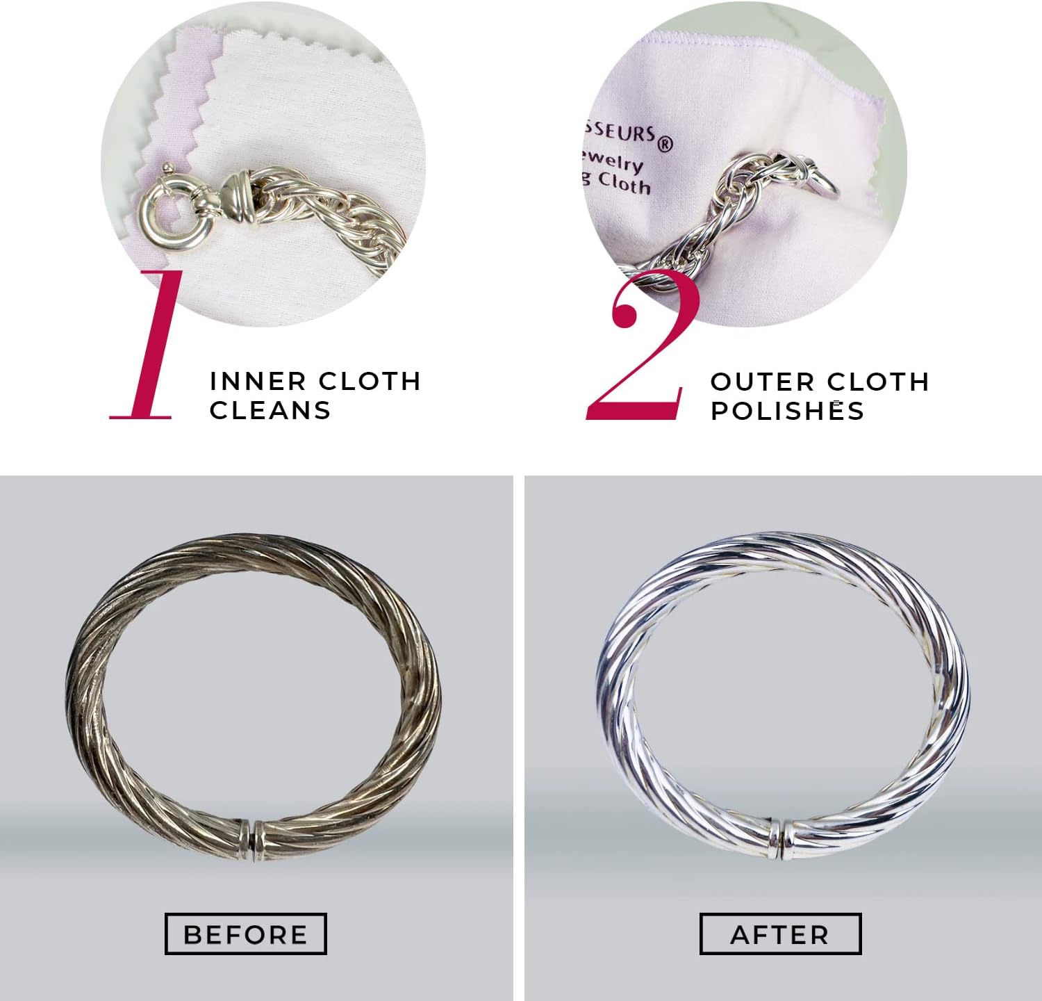 - EASY TWO-STEP PROCESS: Gently rub jewelry with the lighter Ultrasoft inner cloth to remove dirt and apply anti-tarnish shield; Use the darker Ultrasoft outer cloth to buff and polish to a brilliant, lustrous finish