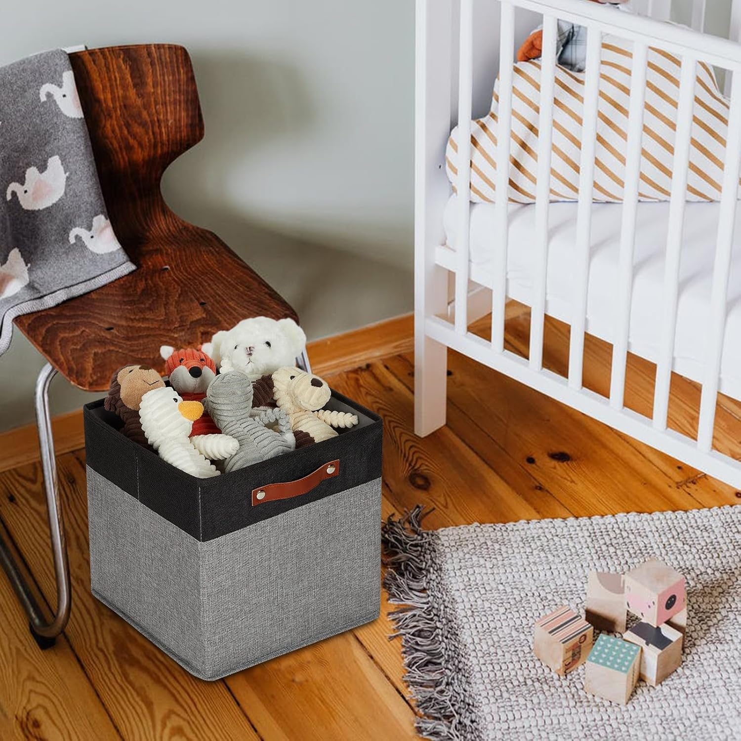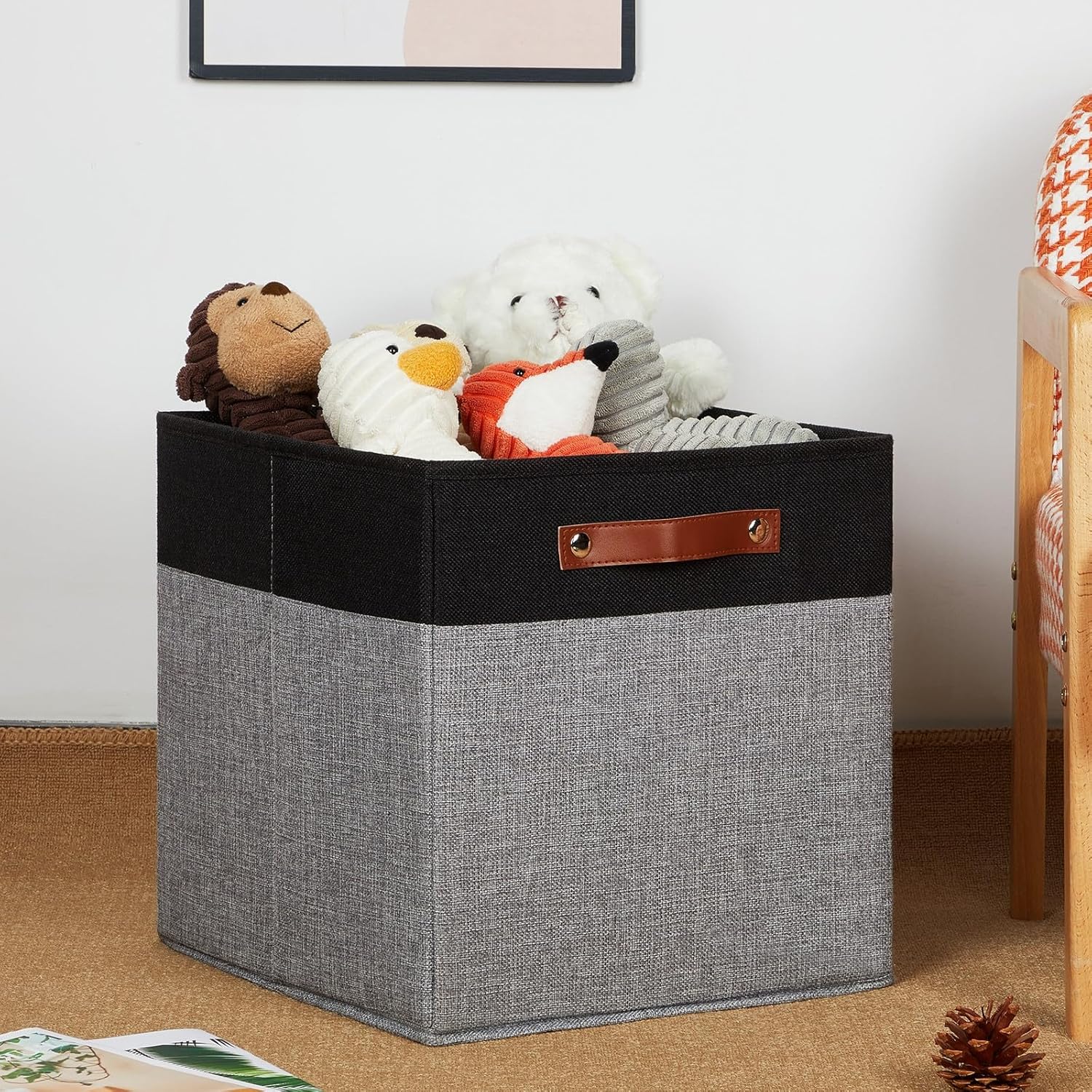 - 【Sturdy Leather Handles】Sturdy thickened leather handles and metal iron buckles make bins for cube organizer easy to carry even with a heavy load. Cardboard is inserted at the bottom and sides to provide support, so that these decorative fabric storage bin to stand on, holding the shape well and can be used for a long time
