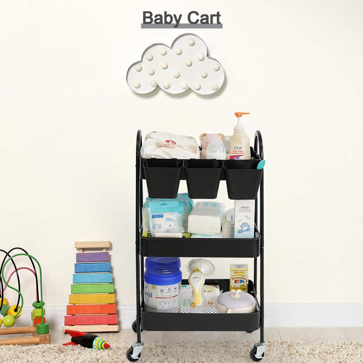 - Smart Storage Design: The 3-tier metal basket is perfect for organizing art supplies, toiletries, office essentials or kitchen spices. The storage cart also comes with 3 hanging cups and 4 hooks to maximize space for small items like brushes, scissors, or kitchen tools