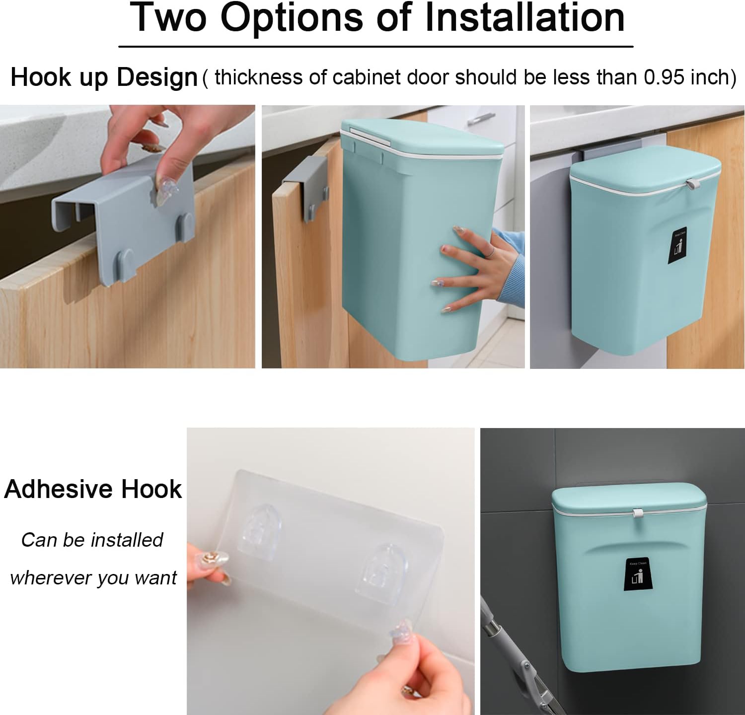 - Wall Mount Trash Can:" Trash bin is easy to install hanging, mount accessory ( 1 hook, 2 adhesive hooks and 20 pcs trash bag ) included, fit for most cabinet doors, pantry doors, cupboard, the thickness of the door should be less than 0.95 inch(2.5 cm); Our trash can is not only fit for kitchen countertop, but also fit under sink