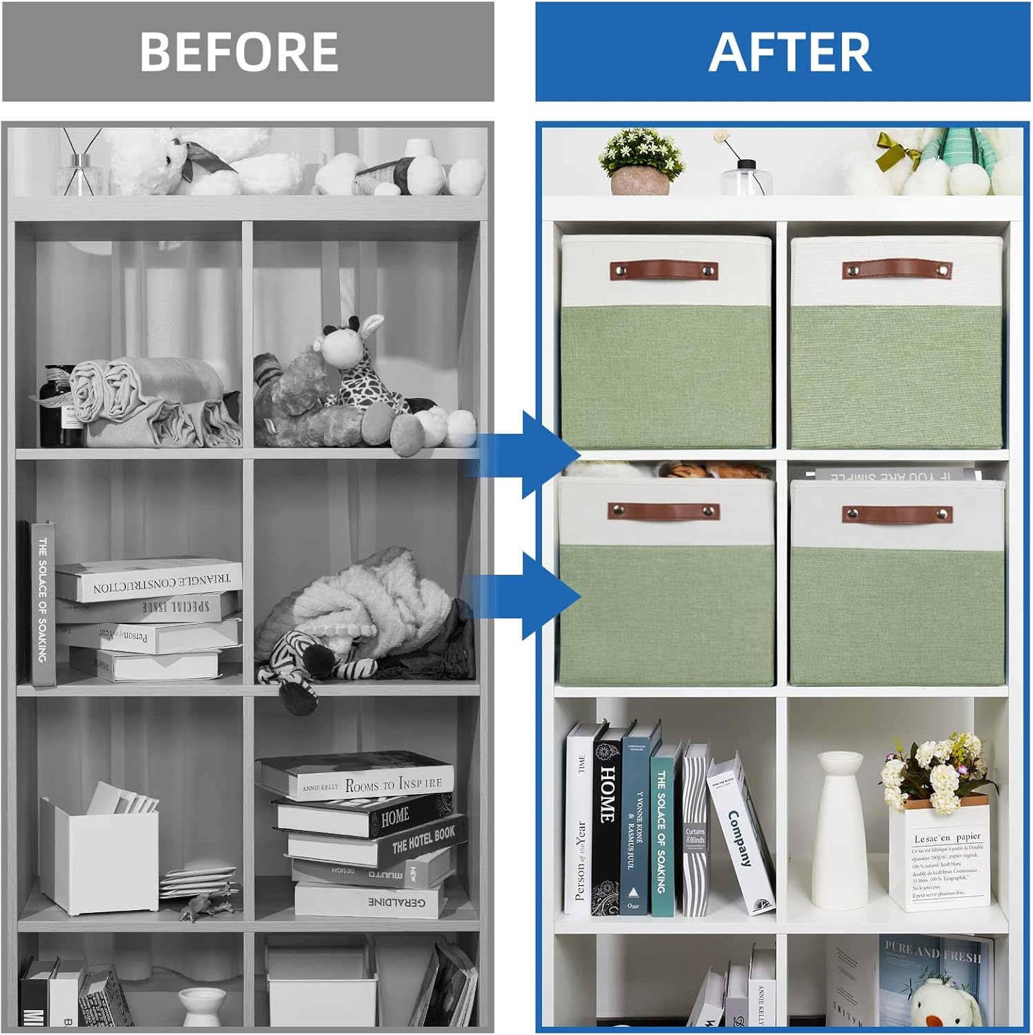 Temary 12 Inch Fabric Storage Cubes Storage Bins with Leather Handles, 4 Pack Cube Baskets Bins for Organizing Closet, Foldable Cloth Baskets for Shelves (White&Green)