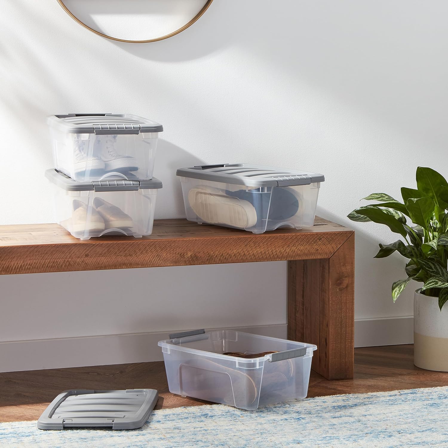 Amazon Basics Plastic Storage Containers with Secure Latching Lids, Stackable Organization Bins, Clear/Grey, 12 Quart, Set of 6