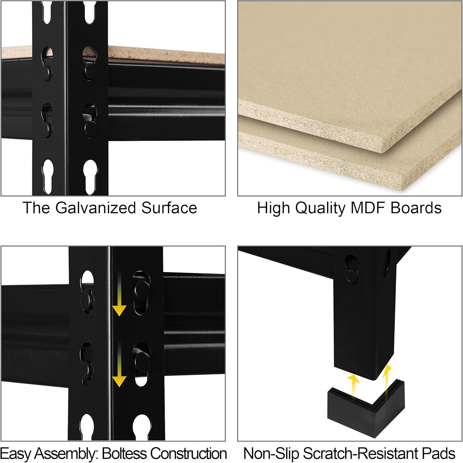 - 【 HEAVY DUTY & LONG-LASTING】 : This 5-tier garage shelving is made of high-quality 0.3" thicker MDF boards and 0.03" thicker heavy duty galvanized metal frame, sturdy and enduring. The metal frame is covered with premium powder coating to give it a smooth surface. Each shelf holds up to 265 lbs, 5 tier shelves' total max load weight is 1325 lbs