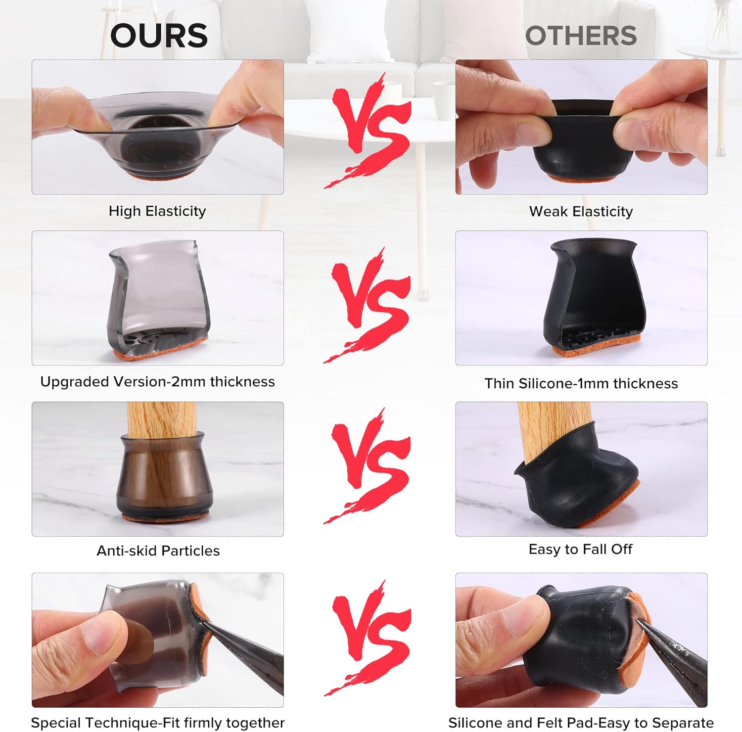 - ✅【Latest Upgrade】Compared with most of the traditional 1mm furniture pads on the market, our chair leg floor protectors are made of 2mm thick silicone, which will never be damaged, durable. The chair leg protectors will not change color when stretched. Inside of the inner sleeves are particles with anti-slip, which will firmly fix the chair and never make the covers fall off. Felt pads at the bottom make your furniture move silently and smoothly along floors without leaving marks and noise.