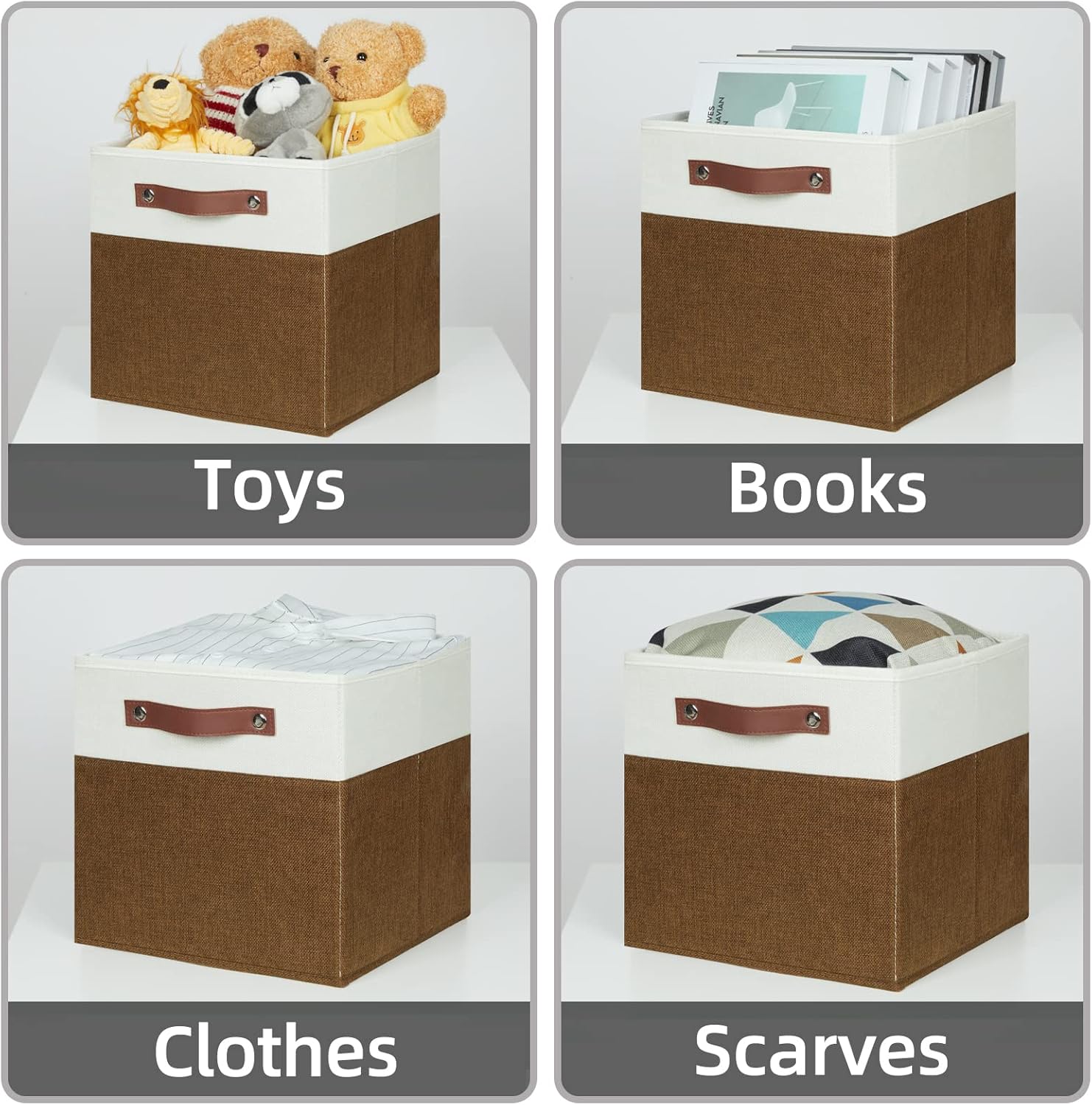 - 【Sturdy Leather Handles 】Sturdy thickened leather handles and metal iron buckles make 11 inch cube storage bin easy to carry even with a heavy load. Cardboard is inserted at the bottom and sides to provide support, so that these fabric bins for cubes to stand on, holding the shape well and can be used for a long time