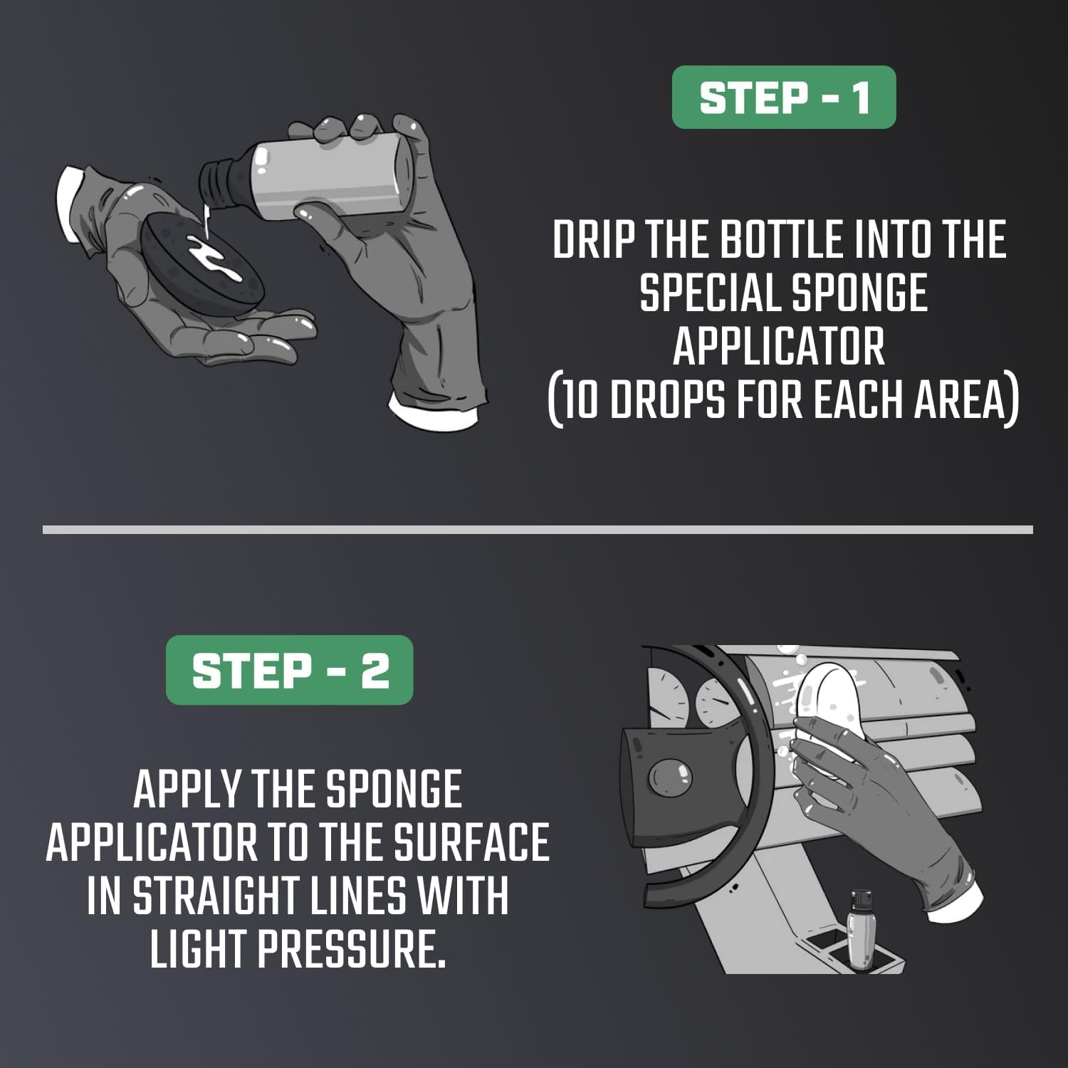 - Easy To Use: It should be well shaken. Always use in well-ventilated areas. Before application, the surface must be cleaned from dirt, residue, and contamination. In order to get the best result, the area to be applied should be completely cool and dry. Drip the bottle into the special sponge applicator. Spread in straight lines and rub deeply into plastic, rubber, and vinyl surfaces.