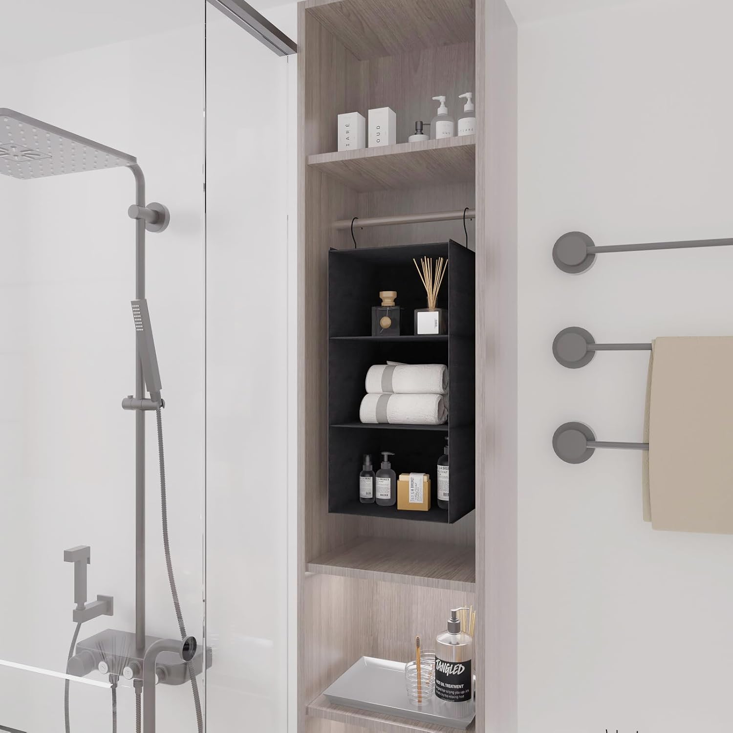 Hanging Closet Organizer - 3-Shelf, Easy Mount Foldable Wardrobe Storage Shelves for Clothes, Handbags, Shoes & Accessories - Washable Oxford Cloth Fabric, Black