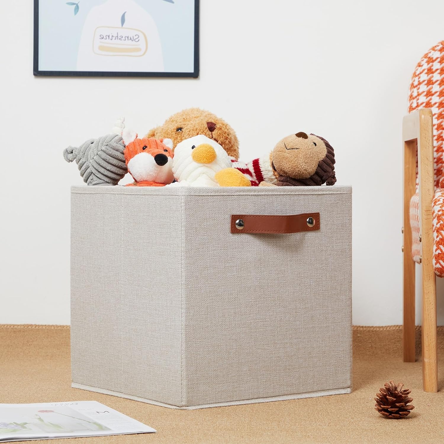 - 【Premium Material】The fabric used in the storage cubes 12 x 12 is fashionable and breathable, sturdy, breathable fabric materials and the cardboard inside is strong and easy to fold. These cream storage cubes for organizing are sturdy enough to hold your stuff well. The leather handle is durable and easy to carry. The product consists of cardboard, and in transportation, the cardboard will exist a little cardboard smell, you can use it before using the ventilation to dry it.