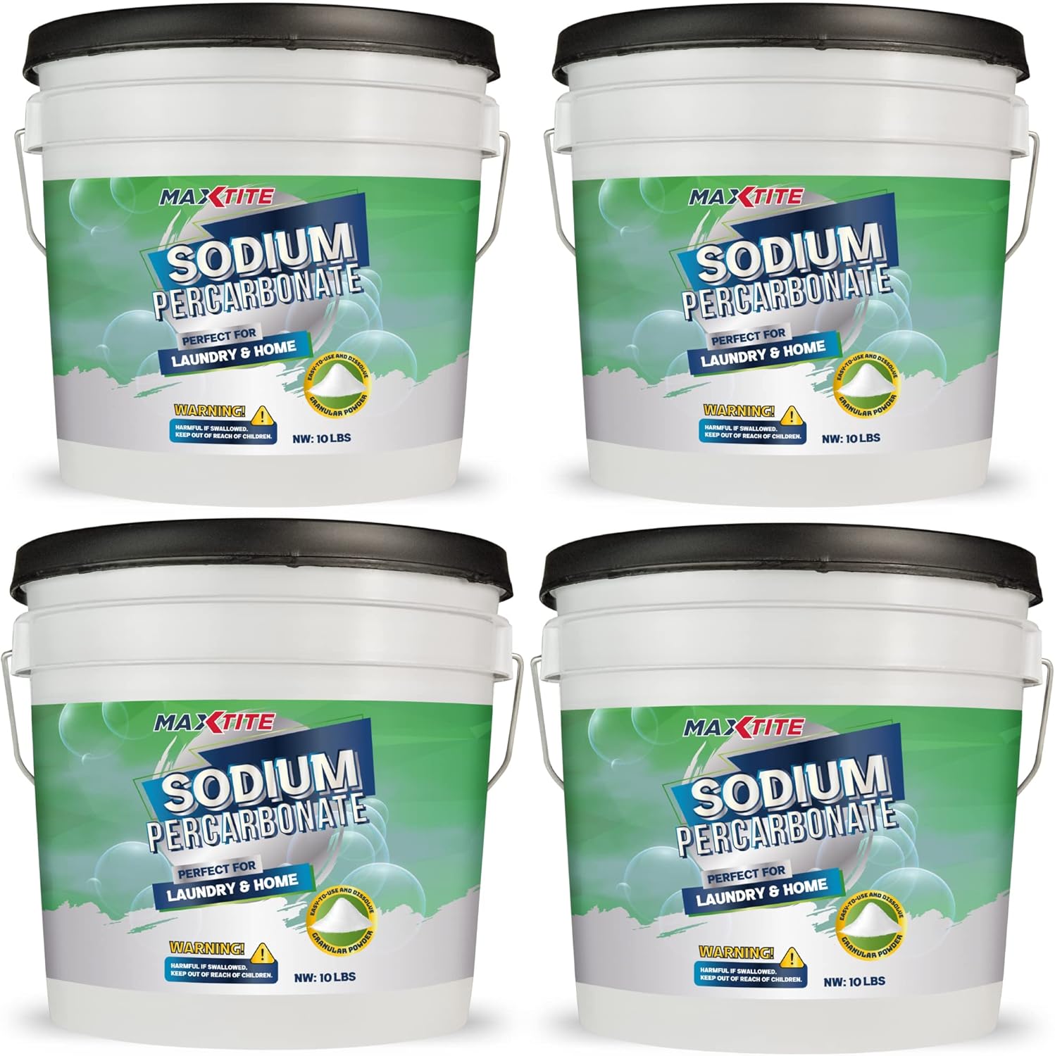 MAXTITE Sodium Percarbonate (40 lbs total, 10 lbs pails 4 Pack) 100% Pure Solid Hydrogen Peroxide/Oxygenated Bleach - Multi-Use Cleaner for Home & Laundry- HDPE w/Resealable Child Resistant Cap