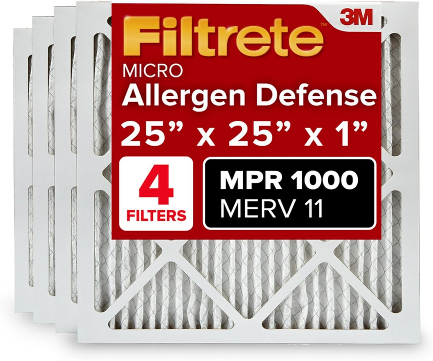 Filtrete 25x25x1 AC Furnace Air Filter, MERV 11, MPR 1000, Micro Allergen Defense, 3-Month Pleated 1-Inch Electrostatic Air Cleaning Filter, 4 Pack (Actual Size 4-Pack 24.688x24.688x0.813 in)