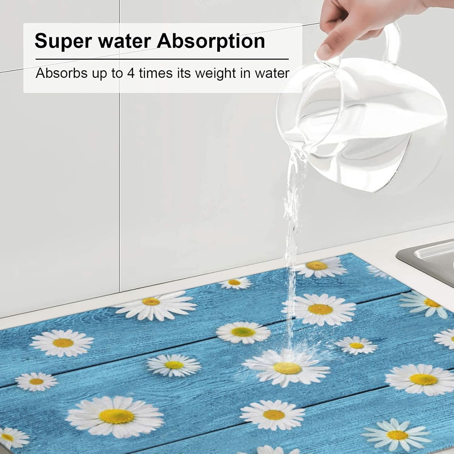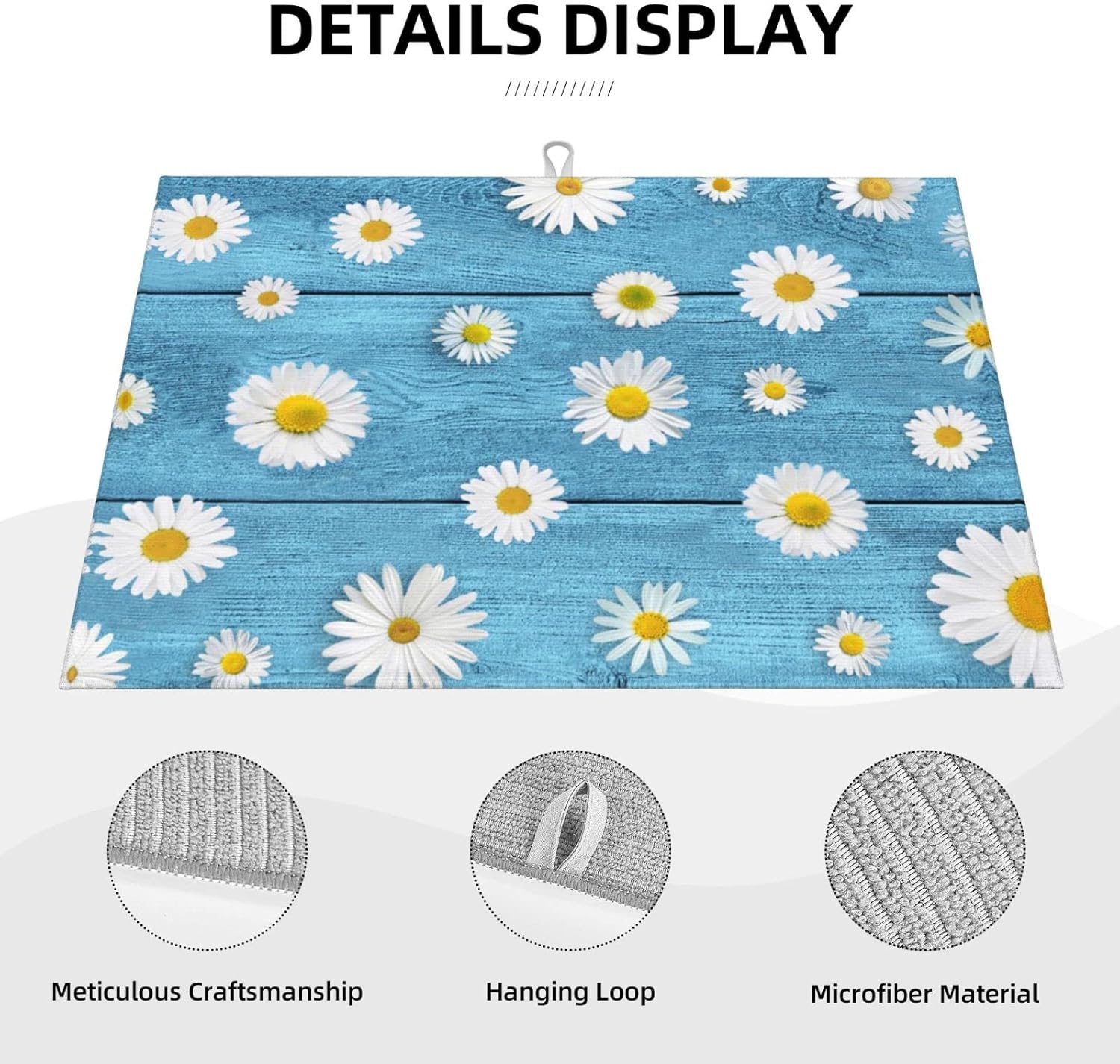 Daisies On Vintage Blue Wood Dish Drying Mats For Kitchen Counter Microfiber Absorbent dish Mat Xl Reversible Drying Mats For Countertop 18 Inch X 24 Inch