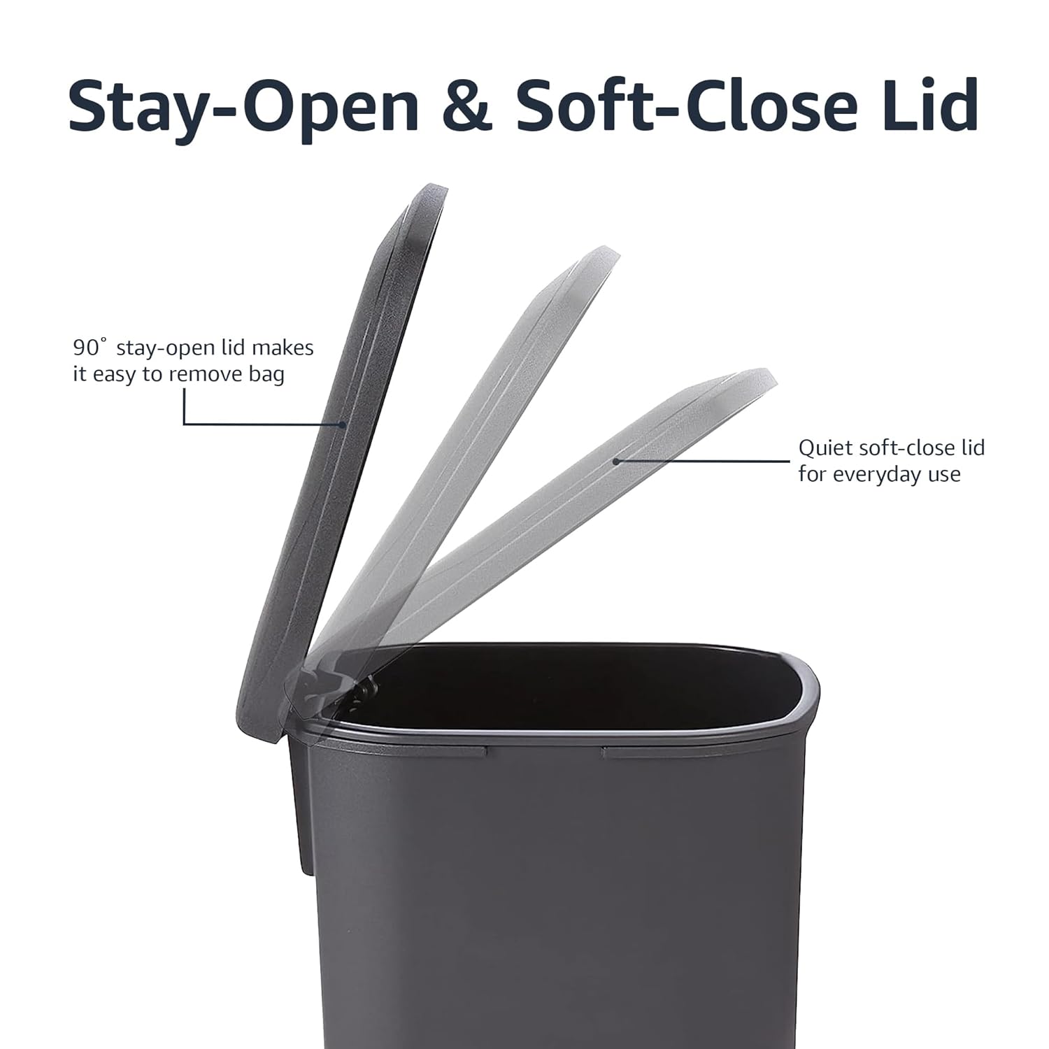 Amazon Basics Compact Plastic Bathroom Trash Can with Hands Free Foot Pedal, Quiet Close Step-On, 6 Liters, Black, Lid Included