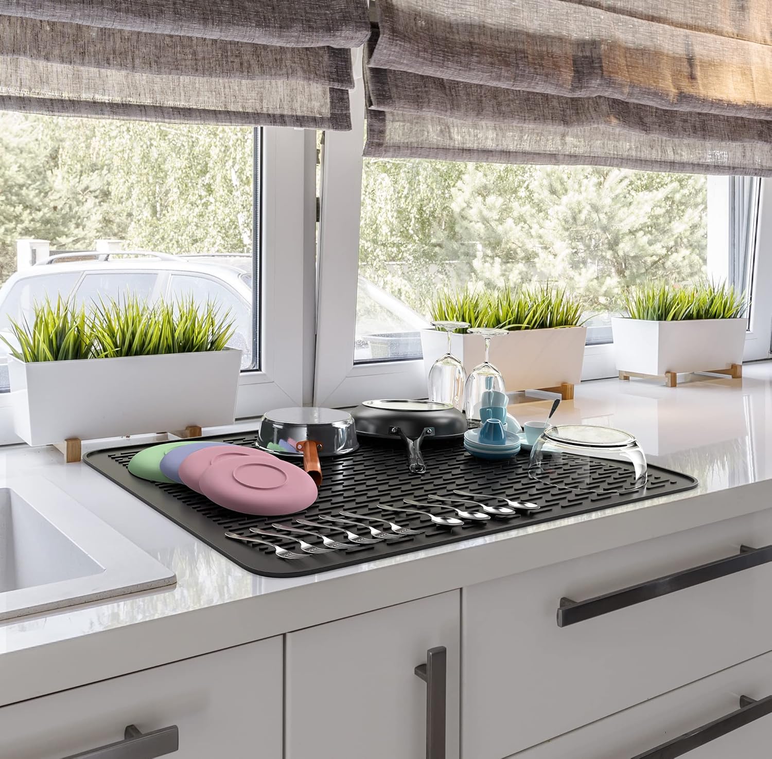 - Super-sized for greater protection and coverage. Extra large silicone mat for under dish drainer- protect your counters from water stains and damage.