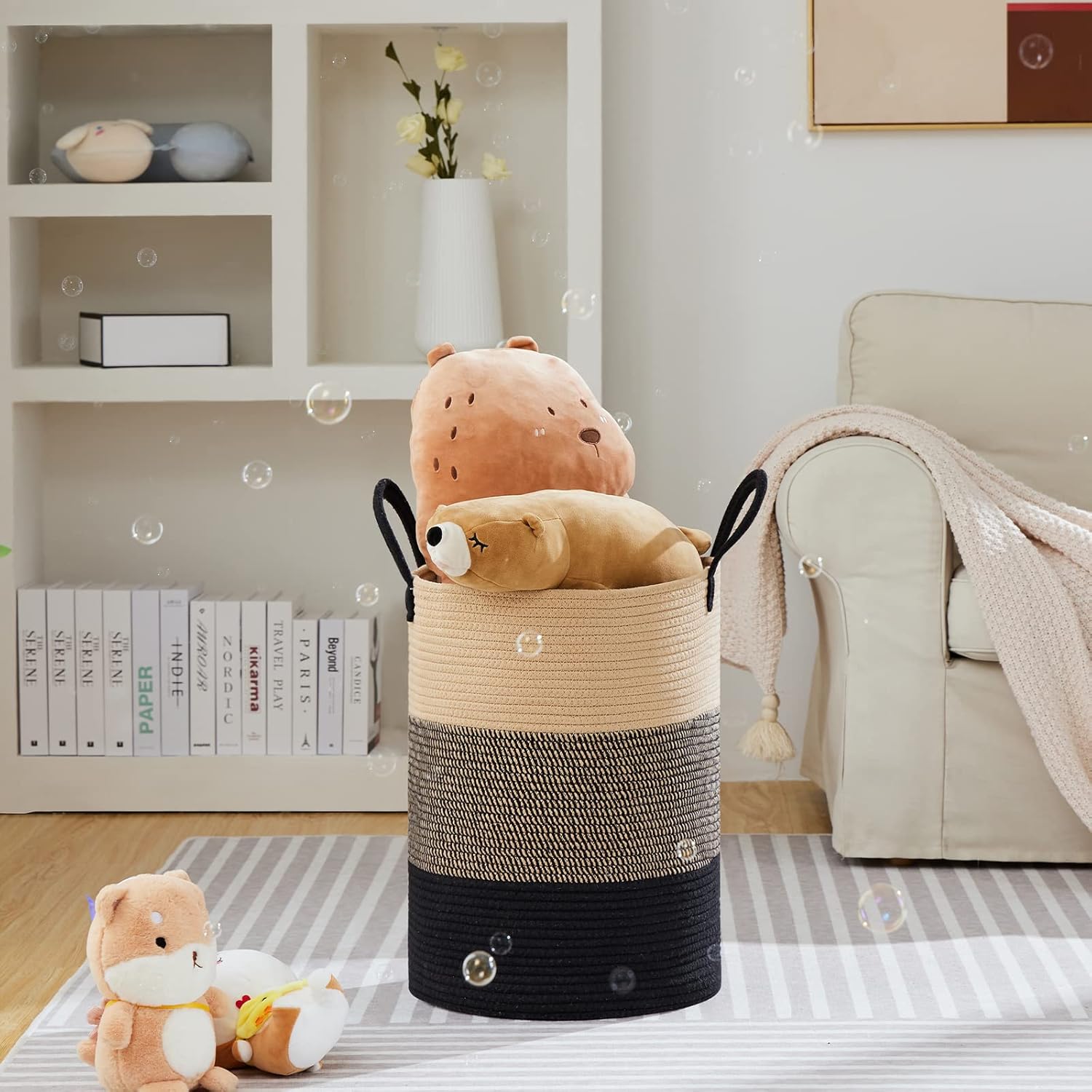 - ❤【Simple & Versatile】 This large decorative basket showcases an aesthetic with its minimalist lines and pops of color. It can be used in different scenarios, such as living room, laundry room, bedroom, bathroom, college dorm, nursery room and so on.