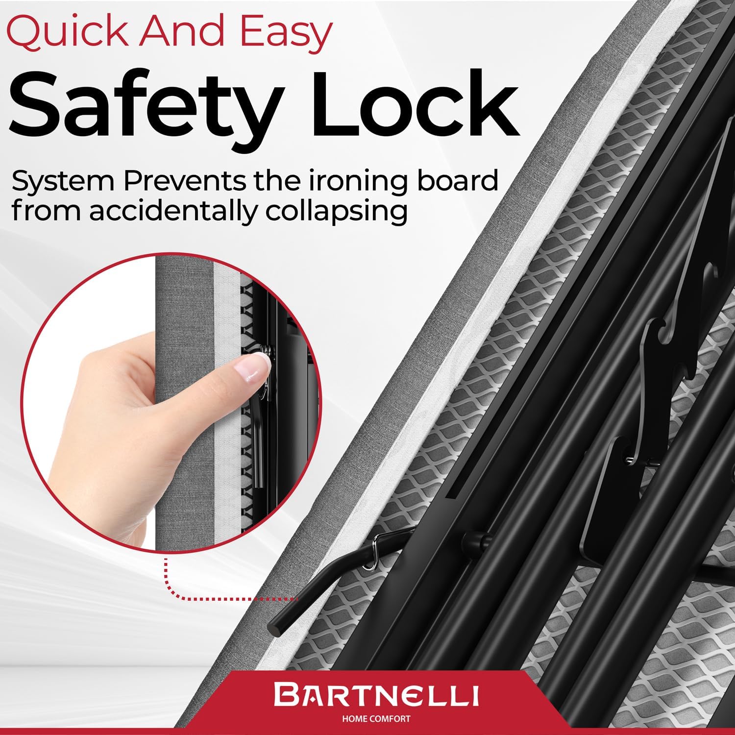 Bartnelli by Rorets Ironing Board Made in Europe | Iron Board with 4 Layered Cover & Pad, Height Adjustable up to 36" Features A Safety Iron Rest, 4 Steel Legs, for Laundry Room or Dorm Use (43x14)