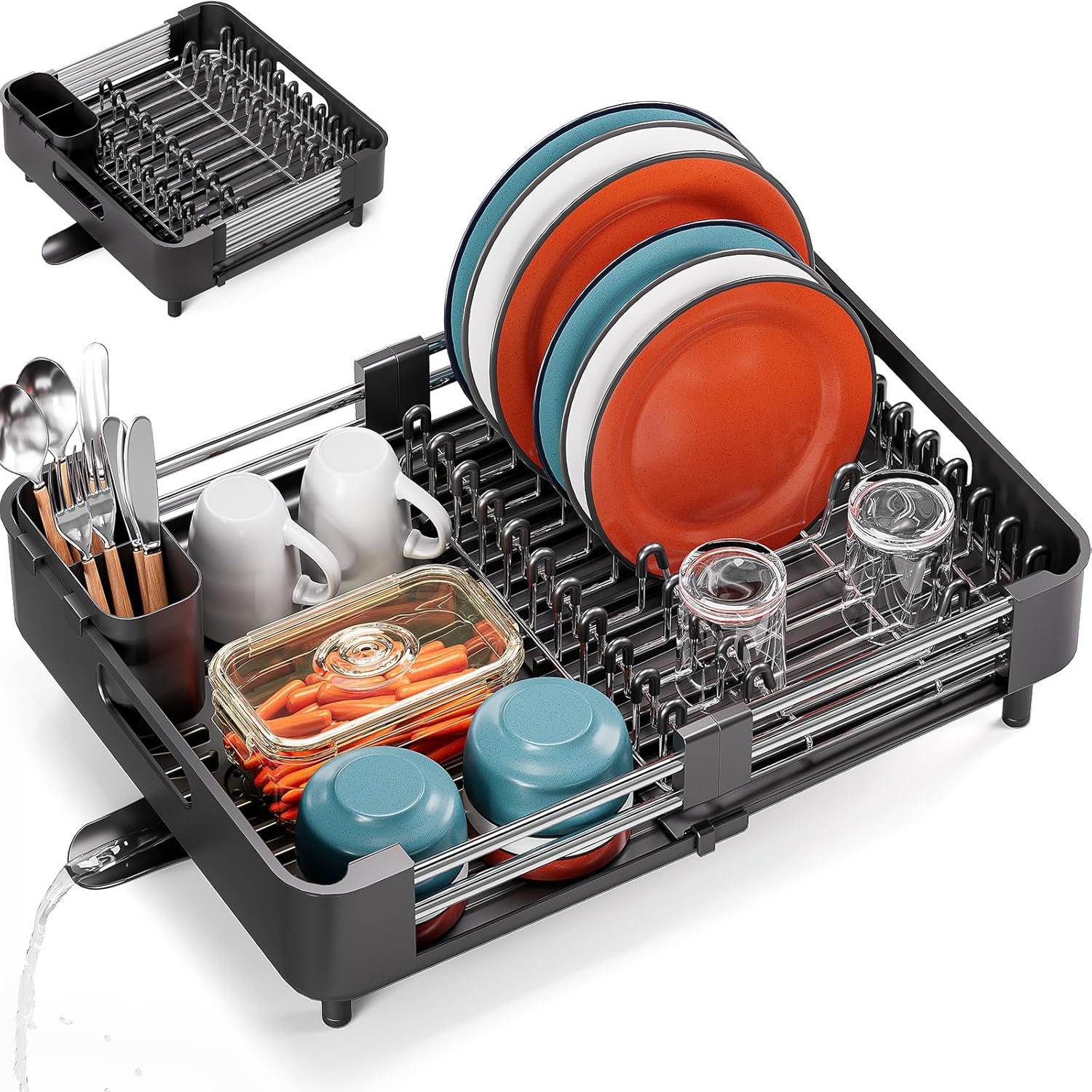 Dish Drying Rack for Kitchen Counter, Extendable Dish Rack with Drainboard, Expandable Dish Drainer, Collapsible Dish Strainer with Cutlery Holder, Foldable Home Countertop Plate Storage Rack, Black