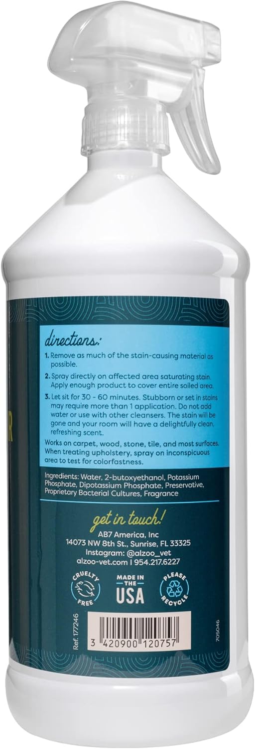 - QUICKLY ELIMINATES PET STAINS & ODORS -ALZOO Stain & Odor Remover is an easy-to-use spray with an effective blend of enzymes, probiotics, and plant-based cleansers that attack and destroy pet stains and odors. Eliminate the toughest pet stains & odors naturally.