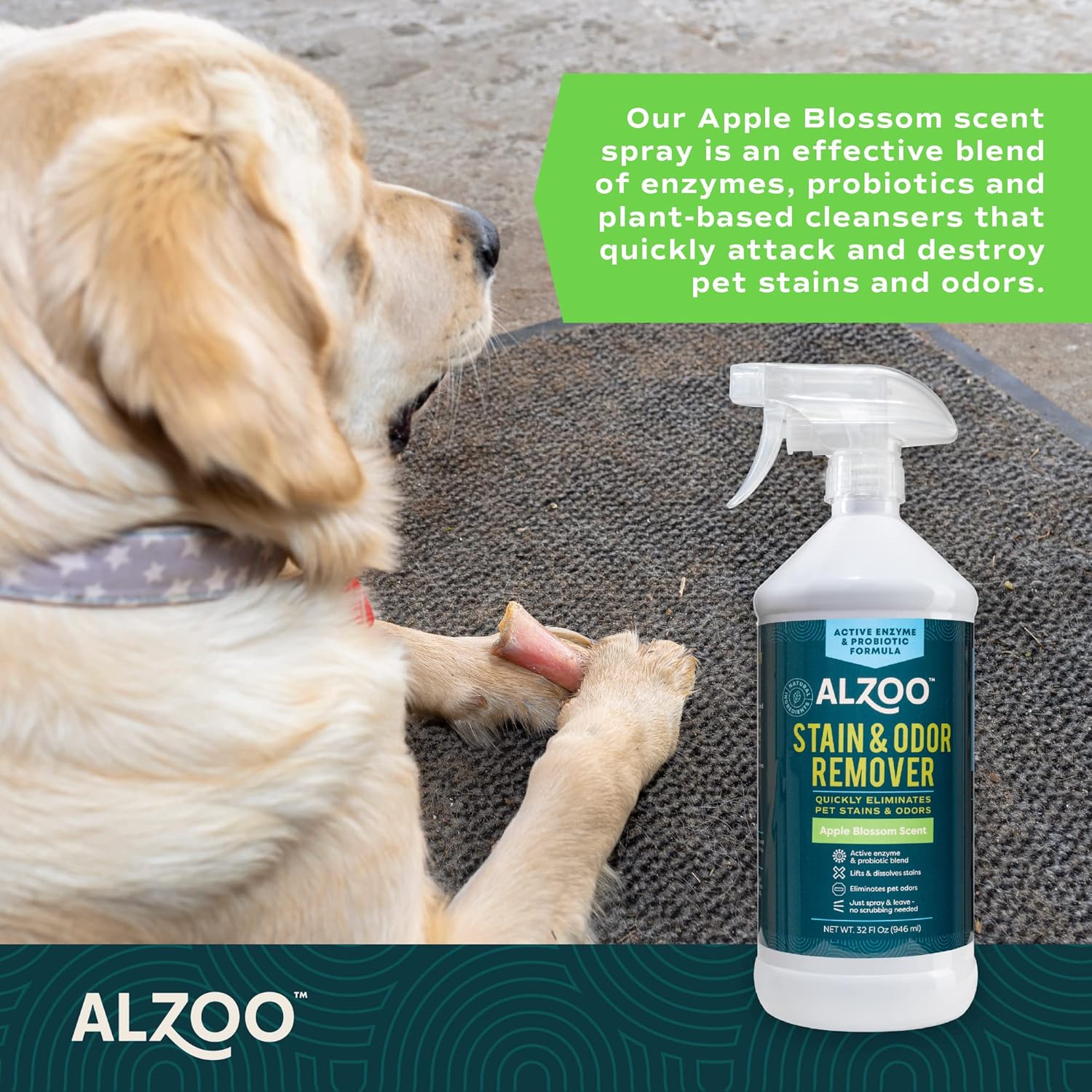 ALZOO Stain & Odor Remover, Quickly Lifts & Dissolves Pet Stains & Helps Eliminate Odors, 100% Plant-Based Active Ingredients, Apple Blossom Scent, 32 Fl. Oz Spray Bottle