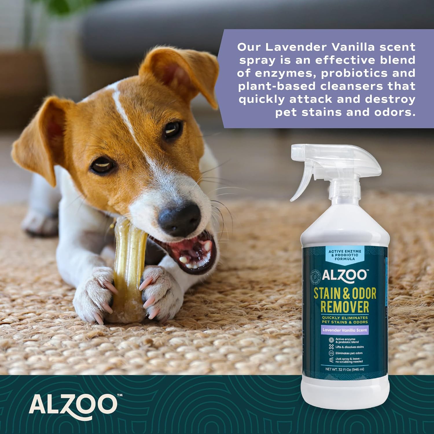 ALZOO Stain & Odor Remover, Quickly Lifts & Dissolves Pet Stains & Helps Eliminate Odors, 100% Plant-Based Active Ingredients, Lavender Vanilla Scent, 32 Fl. Oz Spray Bottle