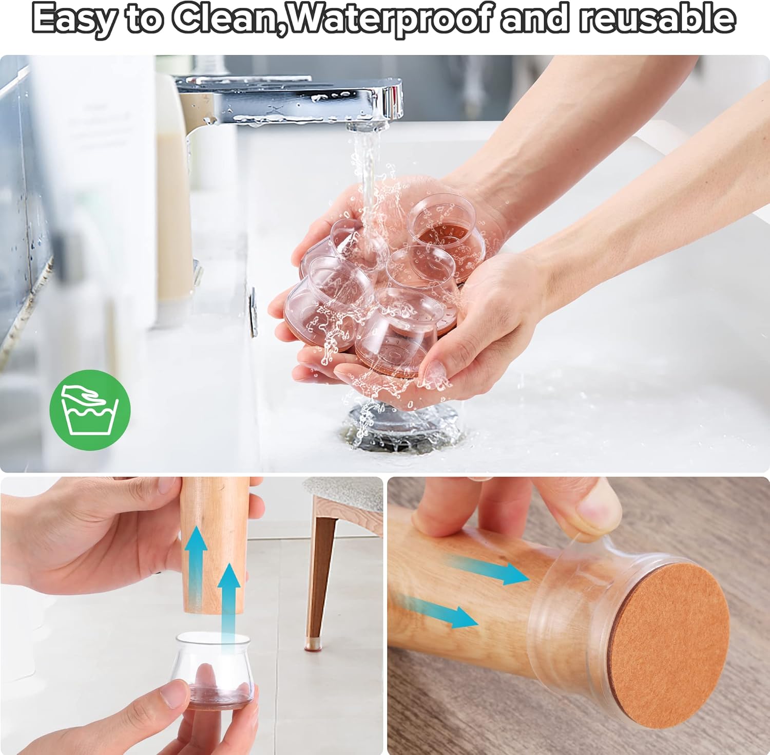 - ✅【Easy to Use】The chair leg covers to protect floors has high transparency, which greatly restore the original color of the table and chair legs, look more natural. The furniture leg cap is easy to install, without the use of tools. When the furniture chair socks are dirty, the chair stoppers can be cleaned and used repeatedly. Mainly suitable for smooth floors such as hardwood, tile, composite floor, and vinyl floor. Clear cap style match with most floors.