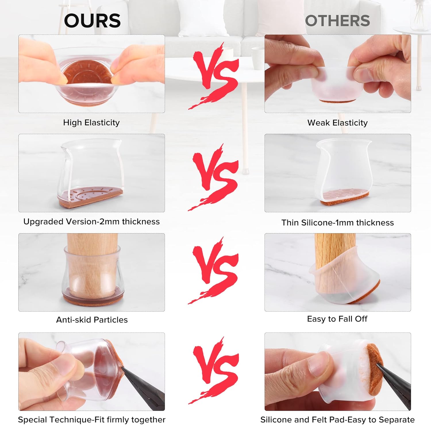- ✅【Latest Upgrade】Compared with most of the traditional 1mm furniture pads on the market, our chair leg floor protectors are made of 2mm thick silicone, which will never be damaged, durable. The chair leg protectors will not change color when stretched. Inside of the inner sleeves are particles with anti-slip, which will firmly fix the chair and never make the covers fall off. Felt pads at the bottom make your furniture move silently and smoothly along floors without leaving marks and noise.