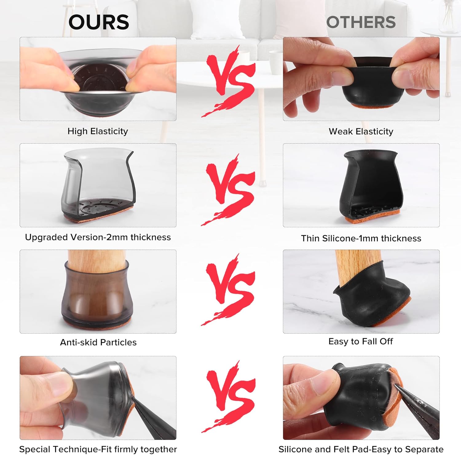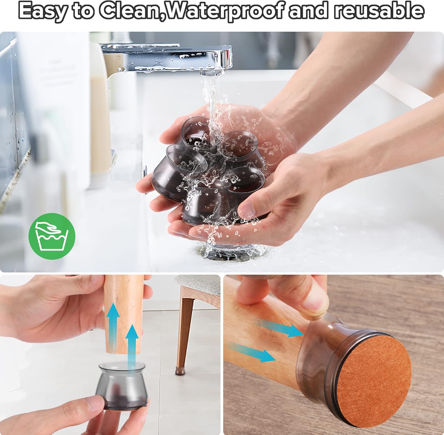 - ✅【Latest Upgrade】Compared with most of the traditional 1mm furniture pads on the market, our chair leg floor protectors are made of 2mm thick silicone, which will never be damaged, durable. The chair leg protectors will not change color when stretched. Inside of the inner sleeves are particles with anti-slip, which will firmly fix the chair and never make the covers fall off. Felt pads at the bottom make your furniture move silently and smoothly along floors without leaving marks and noise.