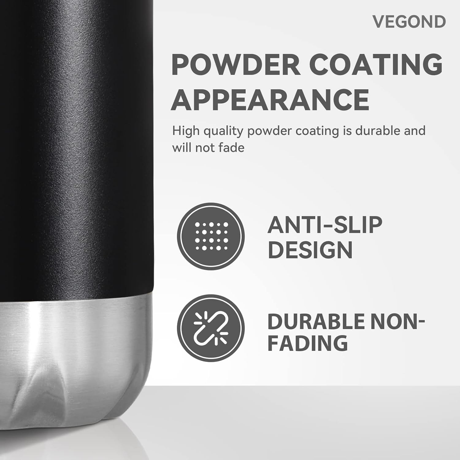 - All Day Heat / Cold Preservation : VEGOND double wall vacuum sports water bottles feature advanced heat preservation technology, keep your favorite drinks cold for up to 24 hours and hot for up to 12 hours. You can bring hot water, ice water, coffee, drinks with you. A 1.25”-diameter mouth accommodates small ice cubes and chopped fruits. The metal water bottle feature humanized design allows you to enjoy coolness in the hot summer and warmth in the cold winter