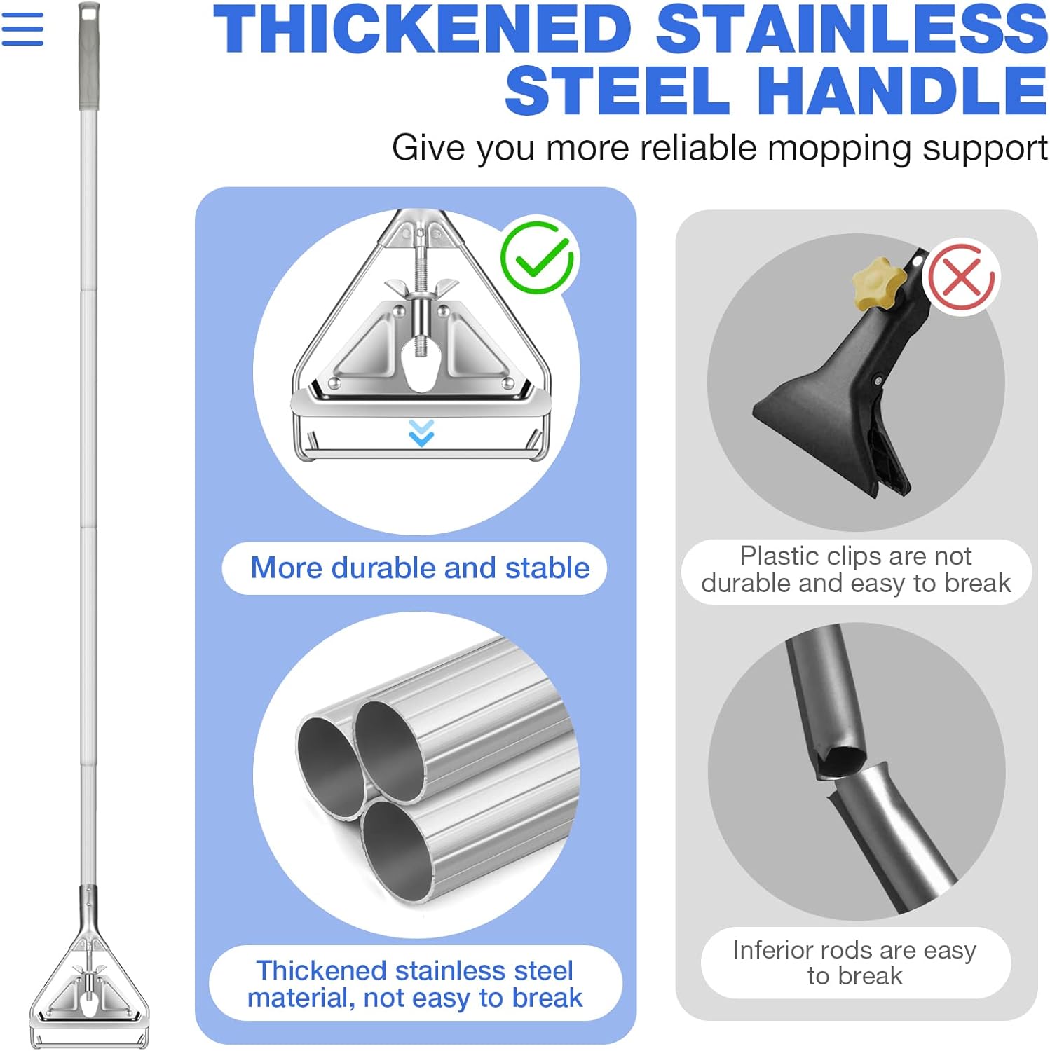 - 【Stainless steel mop head connector】Our commercial mops head connectors are stainless steel designed to be more durable and stable than plastic clips. So you no longer have to worry about the mop head falling off or loose during use . Which makes you to get a more stable and durable cleaning tool
