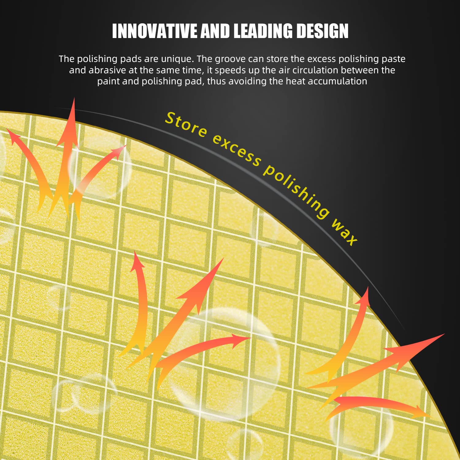 - [Innovative design] The groove can store excess polishing paste and abrasives; at the same time, it speeds up the air circulation between the paint and the polishing pad and avoids the accumulation of heat;