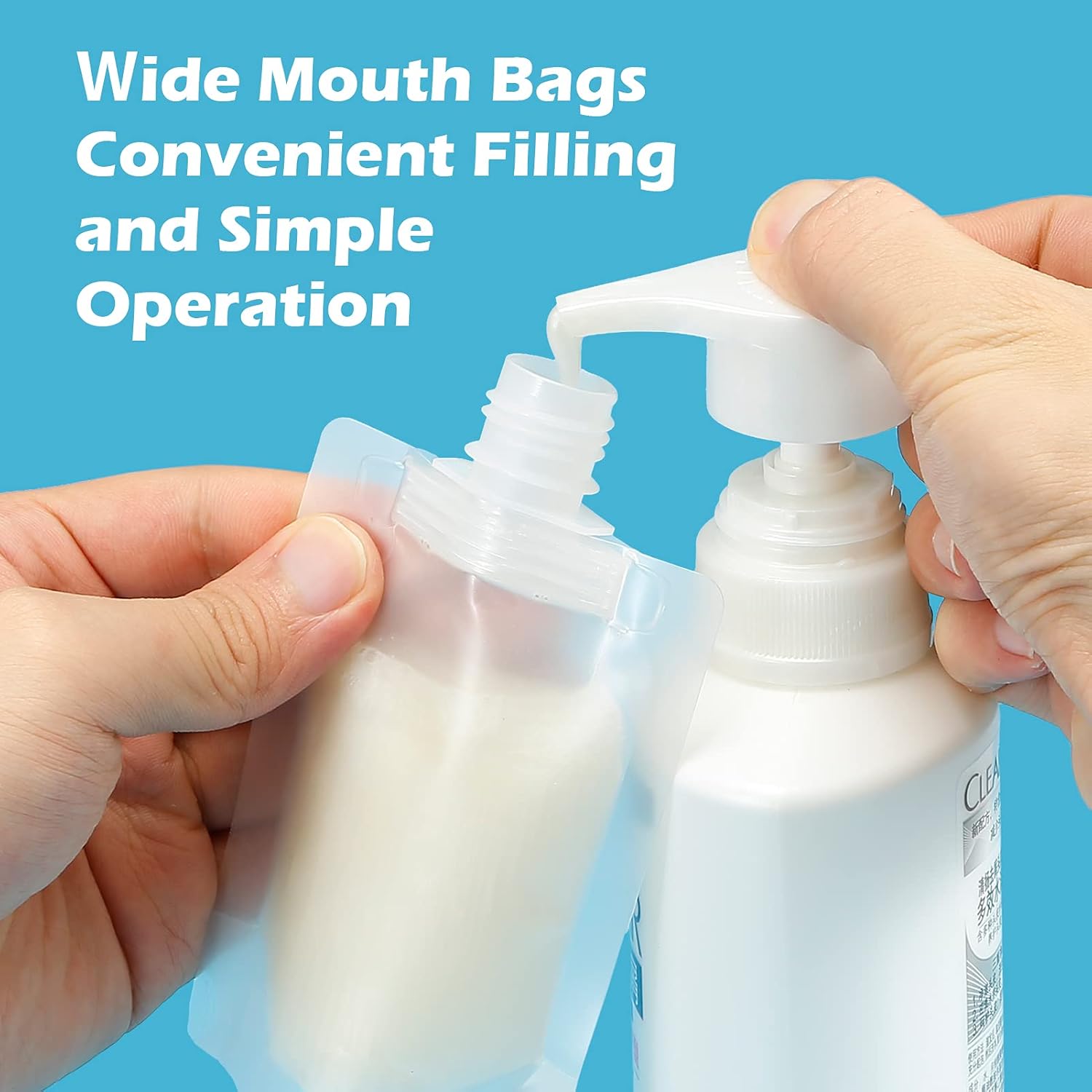 - BAG SIZE - A set of 12 refillable bottles perfect for all your travel needs! Includes 6 pouch with a 1.7 oz capacity and 6 pouch with a 3.4 oz capacity.