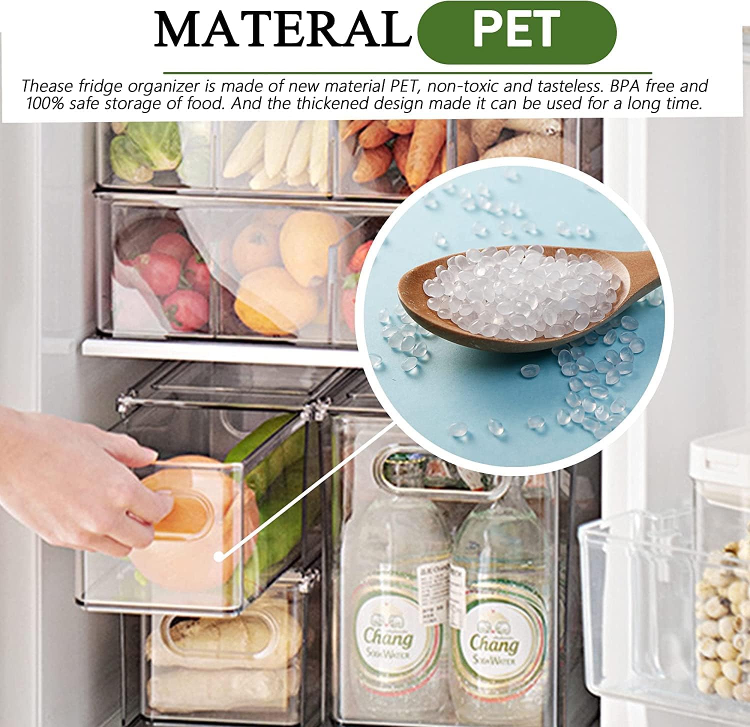 - [Safe & Sustainable Material]Our plastic organizer bins is made of PET, non-toxic and tasteless and safe storage of food. The is made of thicker, stronger, and more Sustainable PET materials than most similar products, the thickened design made the fridge drawer organizer very sturdy, can be used for a long time. Our fridge organizer bins can resist high temperature and strong low temperature. Easy to clean them, soap & water or vinegar & a rinse are working just fine. (Please Note the size of the product.)