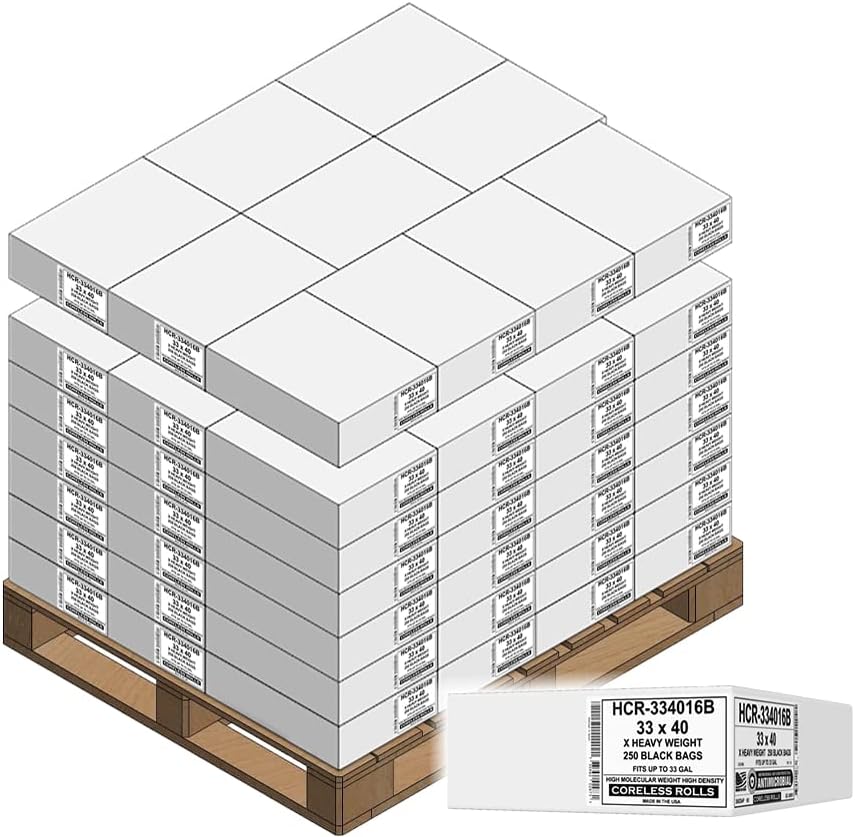 Aluf Plastics 33 Gallon Black Trash Bags (250 Count) - 33" x 40" - 16 Micron Equivalent High Density Value Garbage Bags for Bathroom, Office,Municipal(1 Pallet of 70 Cases, 17500 Bags Total)
